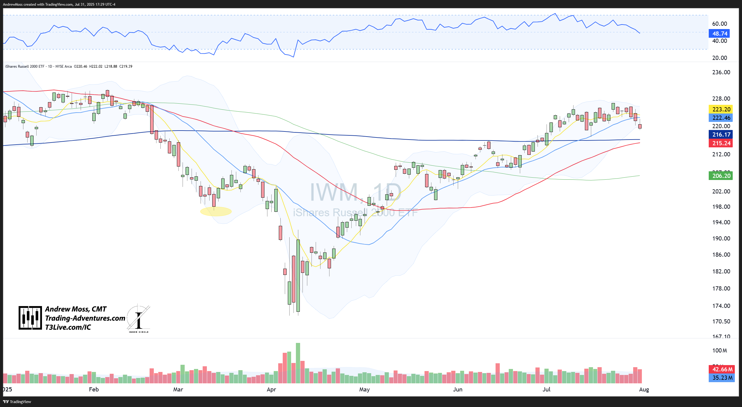 IWM and DIA finished below their 21‑day SMAs, showing continued underperformance from small caps and industrials.