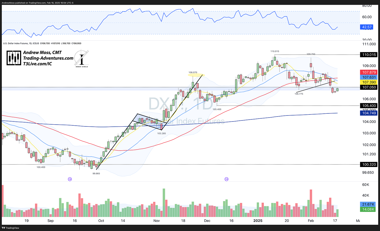 DXY Dollar futures found a reprieve and stopped the downward slide, at least for today. The $107.05 pivot is the lid.