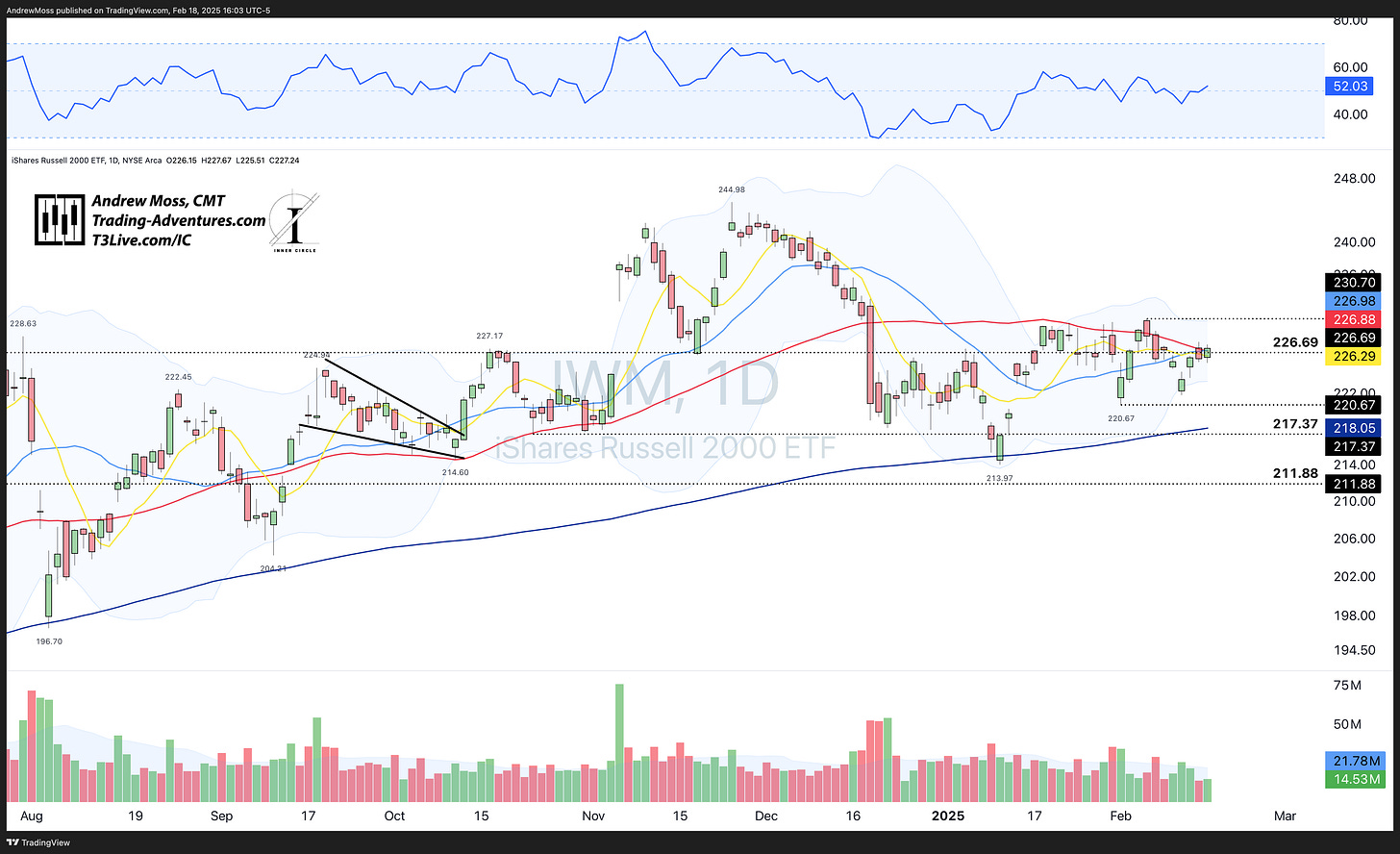 IWM is still in the fight. But it's 5 on 1 with a $226.69 pivot level, and the 8, 21, 50, and 100-day MAs are all ganging up. It closed above all of those, but not by much.
