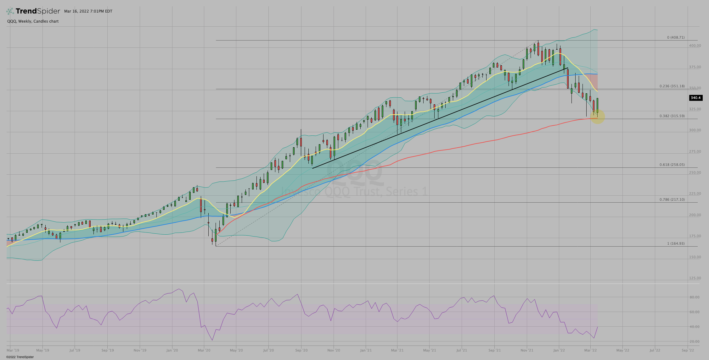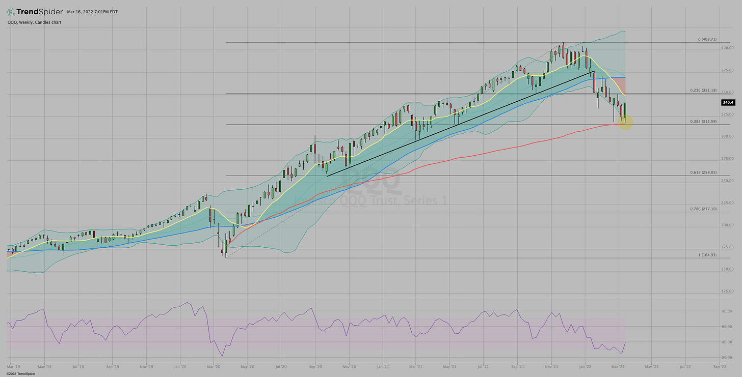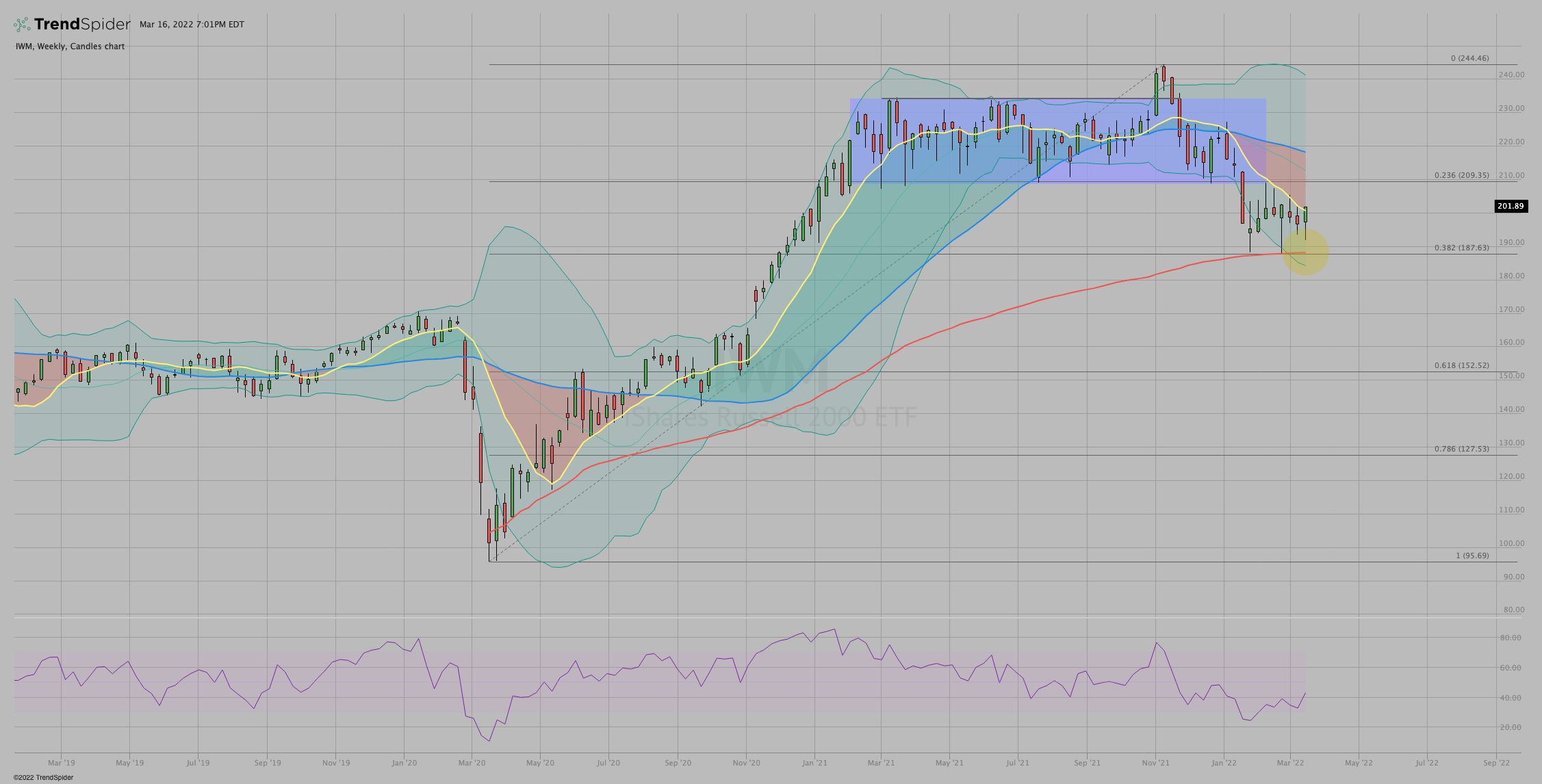 Moving to a weekly chart we can see the $QQQ and $IWM are bouncing in a reasonable place.