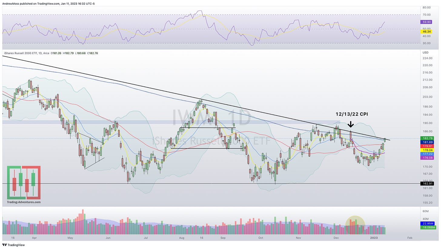 IWM — Once again it is back to the downtrend line and 200-day MA. Probably not a coincidence that it was in a very similar position for the last CPI announcement on December 13, 2022. The reaction tomorrow will be telling.