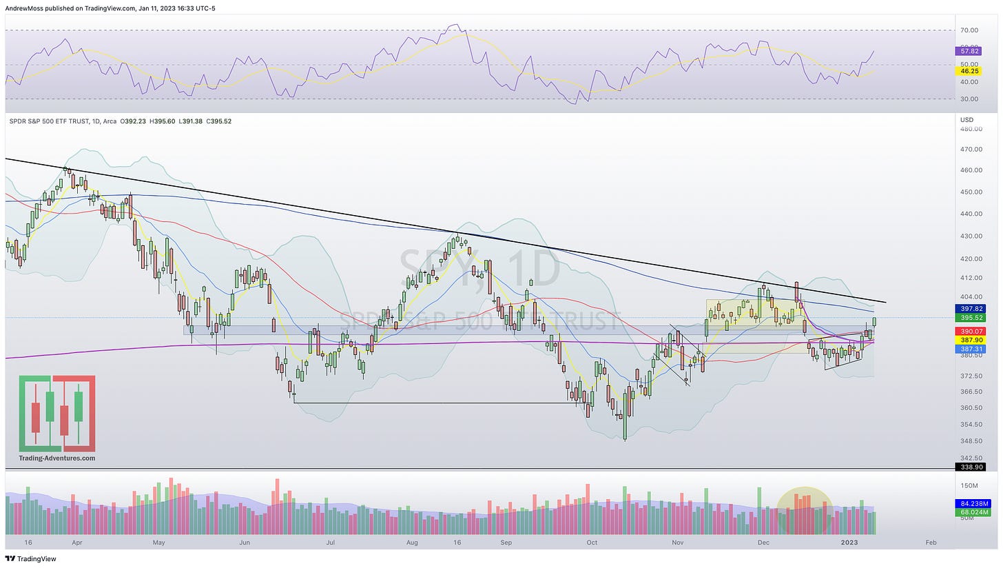 The major indexes continue to improve so far in 2023 and prices have passed some of the tests we’ve been watching for (various anchored VWAP and support/resistance zones) while moving closer to the next ones (downtrend lines and 200-day moving averages.)
