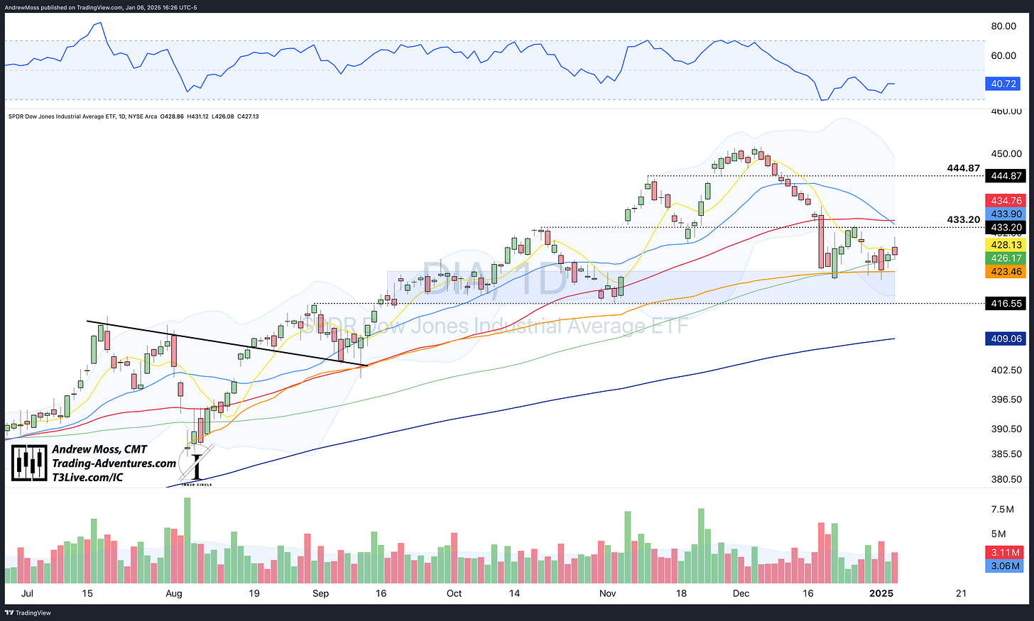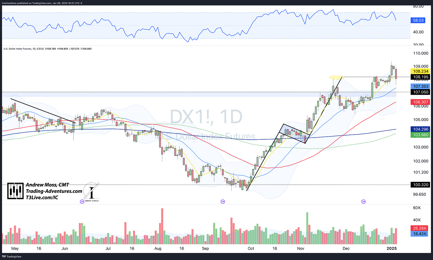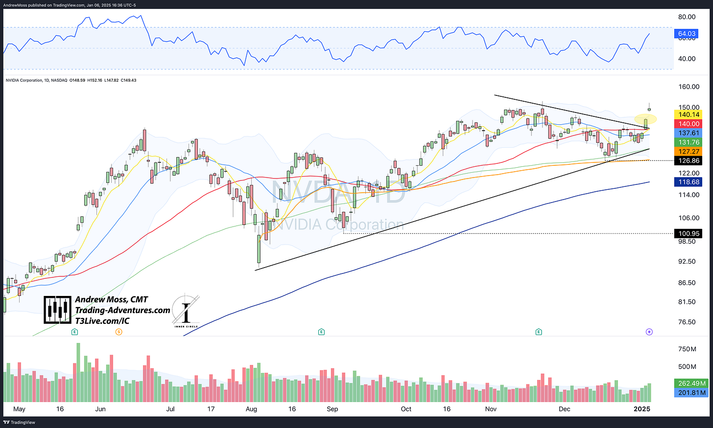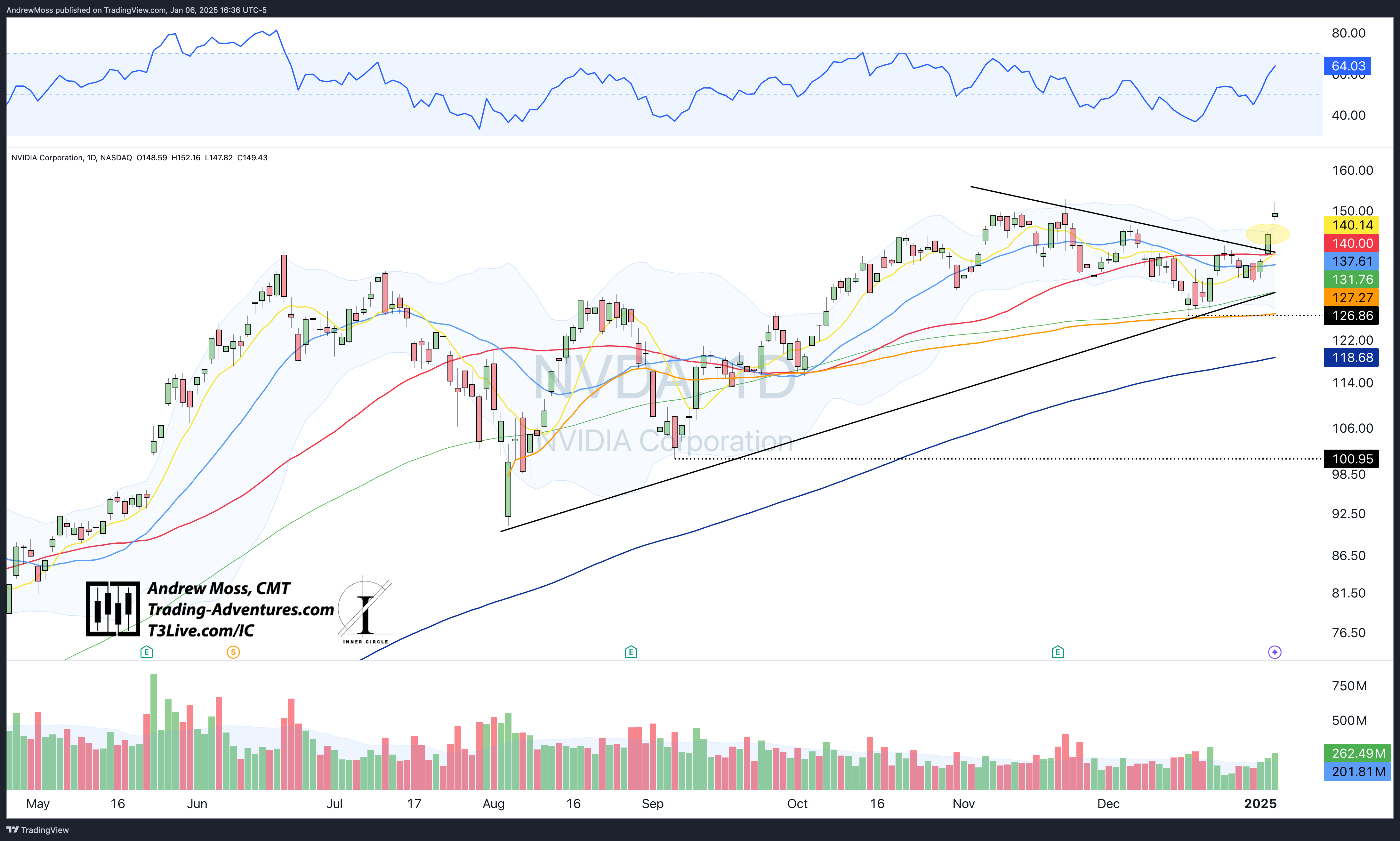 NVDA was a bright spot today as it notched a new all-time closing high with CEO Jensen Huang opened the Consumer Electronics Show (CES). As price breaks out, RSI moves up, and volume outpaces the daily average. Could this be the start of a move to ~$230? So far, it's checking off the boxes of the criteria listed in the 2025 Outlook.