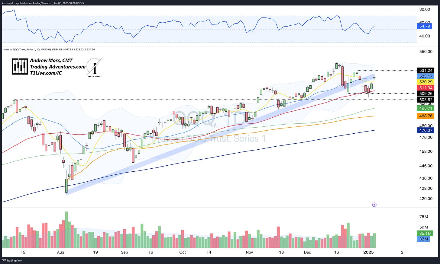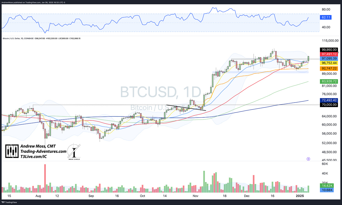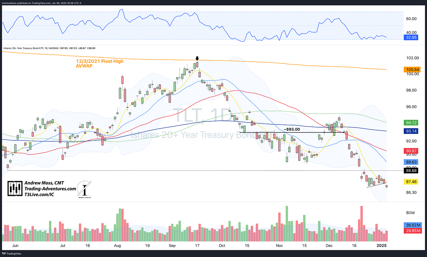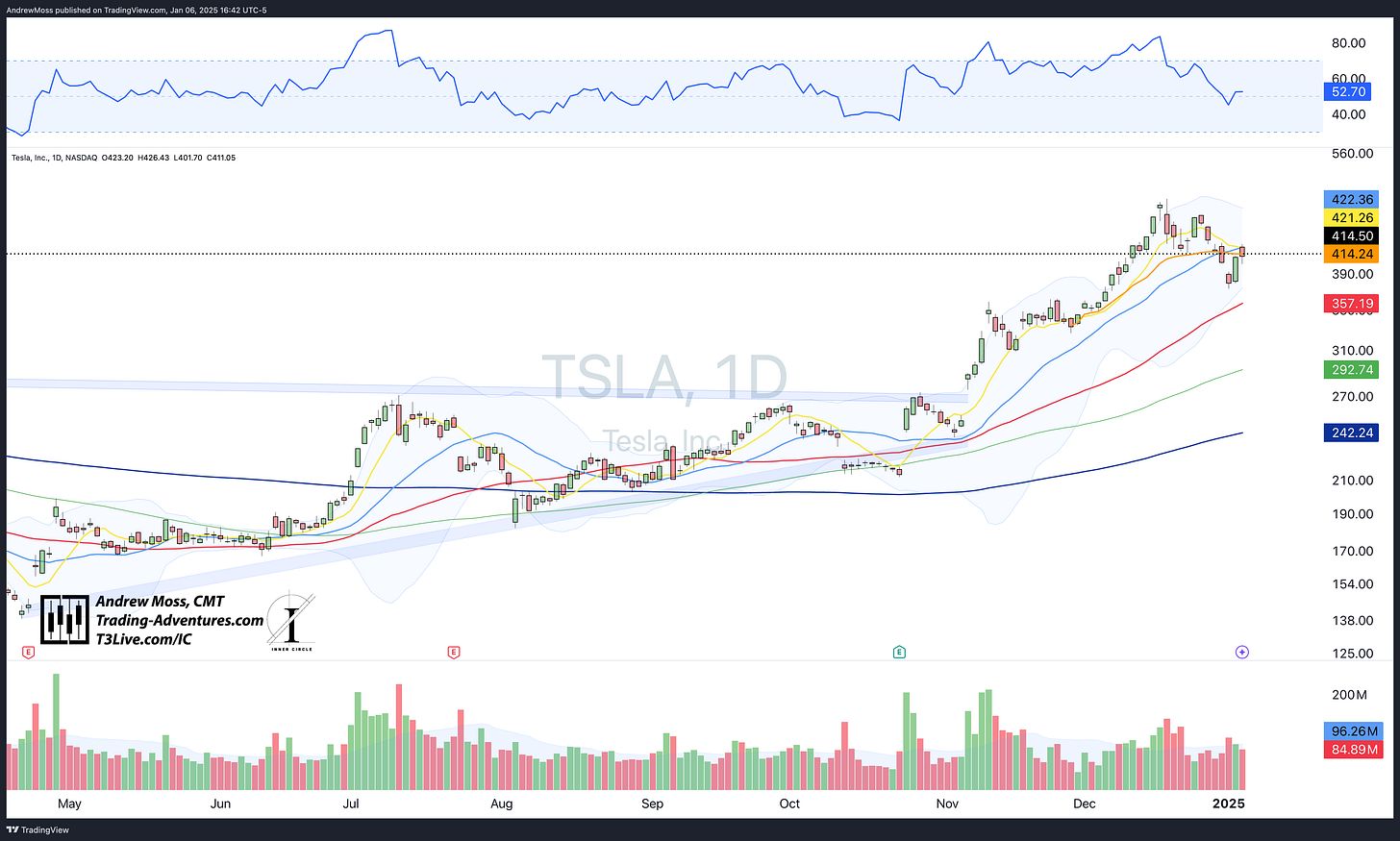 NVDA was a bright spot today as it notched a new all-time closing high with CEO Jensen Huang opened the Consumer Electronics Show (CES). As price breaks out, RSI moves up, and volume outpaces the daily average. Could this be the start of a move to ~$230? So far, it's checking off the boxes of the criteria listed in the 2025 Outlook.