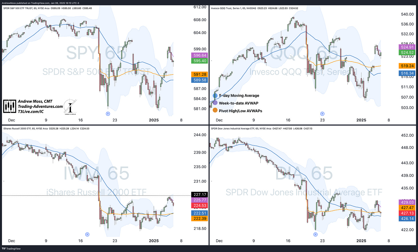 Before we look at that, here’s a check of the roadmap via the 65-minute charts. This morning, prices gapped higher, moving further above the VWAP anchored to the Dec. 18th Fed announcement and the flat to falling 5-day MAs.