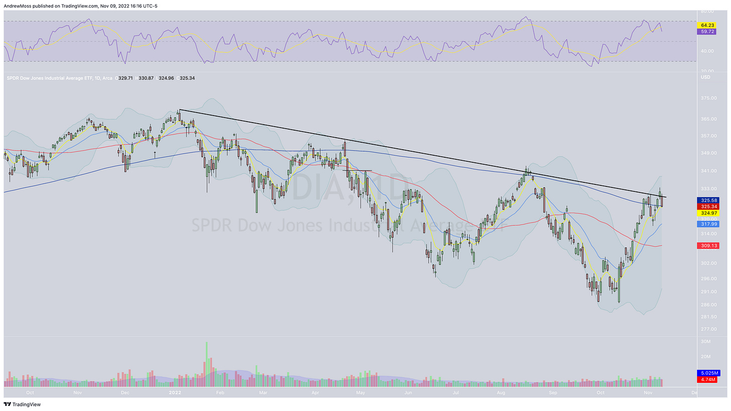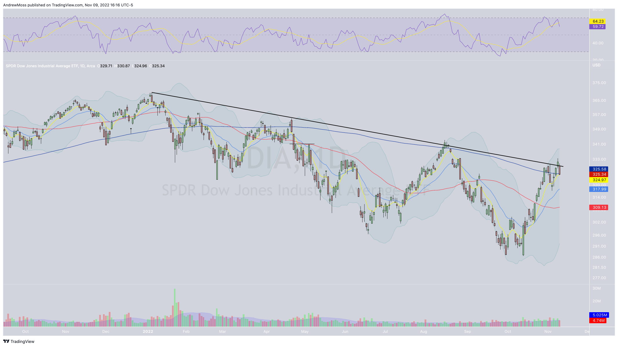 Starting with the leader, $DIA is still forging the path higher. It’s above, or very near the key moving averages. How it handles this trendline will be an important signal.