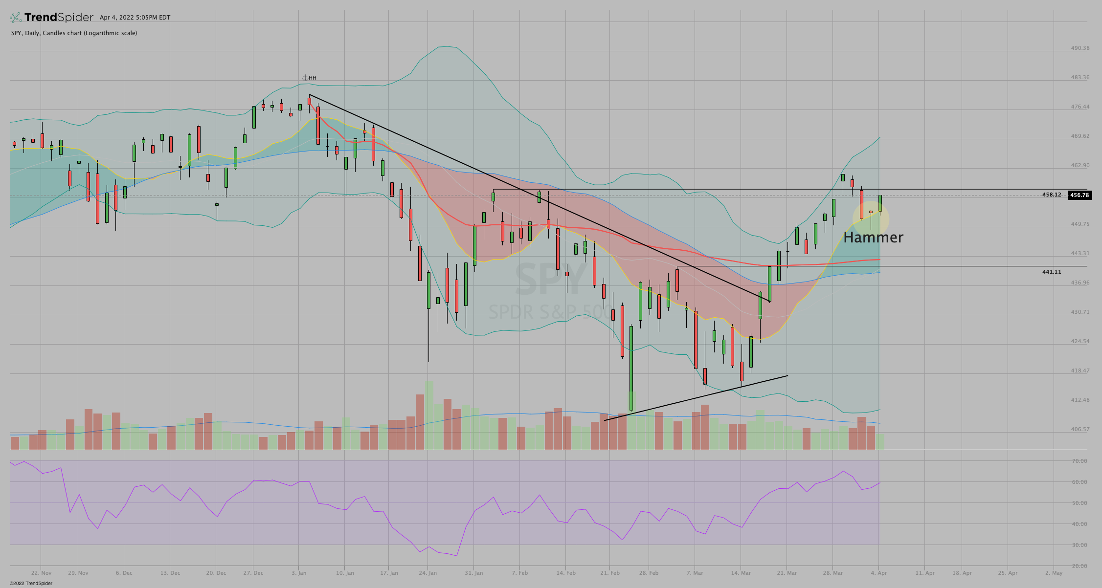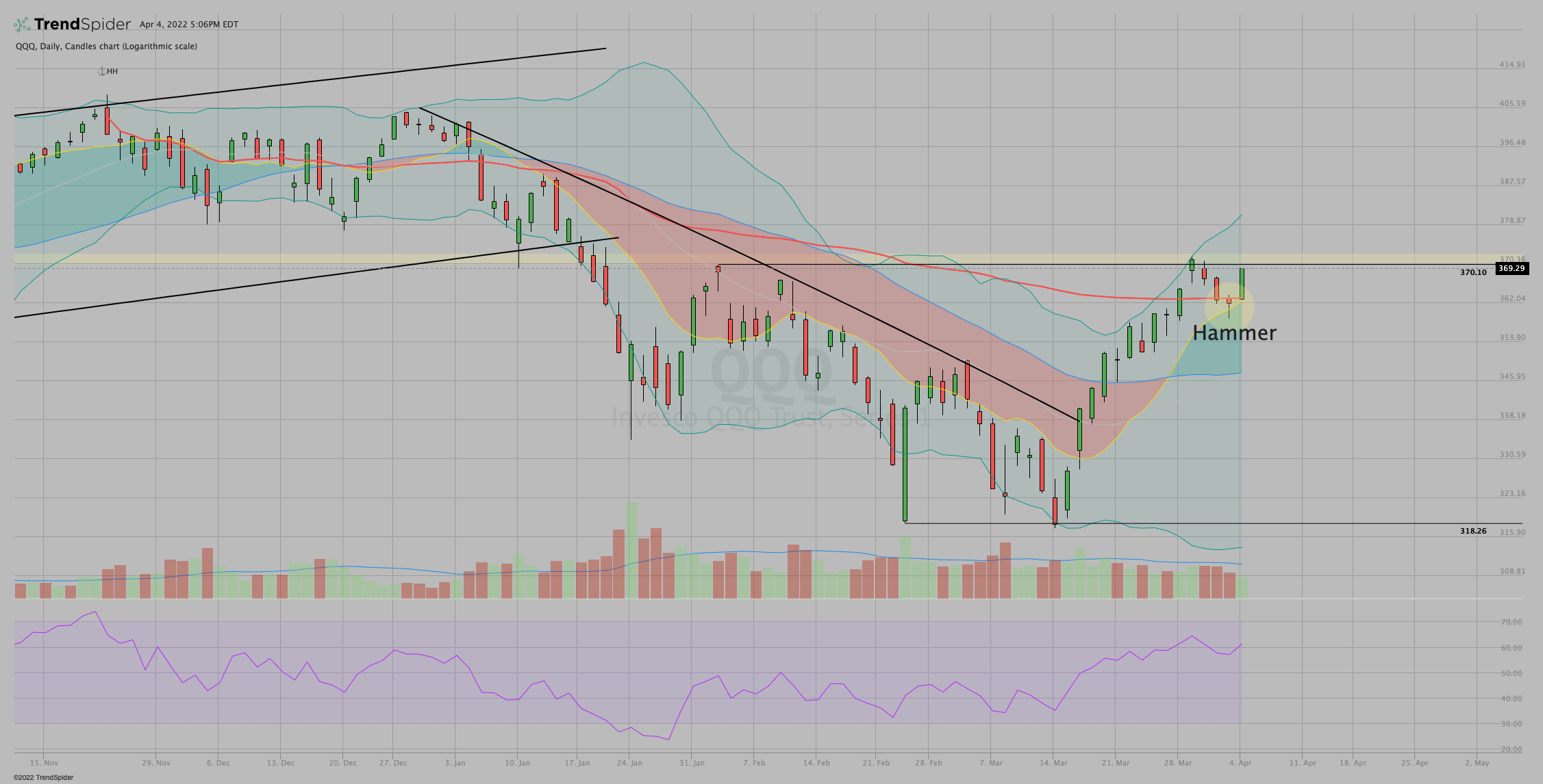 What I didn’t write about was the daily chart pattern which showed a different possibility. Friday’s daily candle for $SPY and $QQQ were hammers. Hammers, as we know, can be early indications of a reversal. They form when the price drifts lower from the open and then rebounds to close back near where it started.