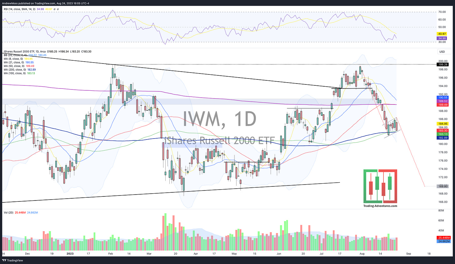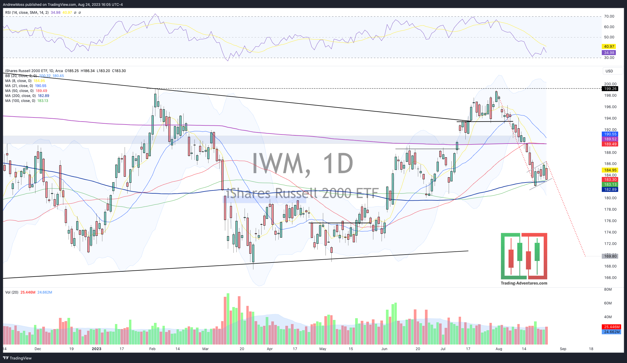 IWM is trying very hard to remain above the 100 and 200-day MAs. Once again, a bear flag pattern is forming. A break lower would have a measured move price objective near $170.