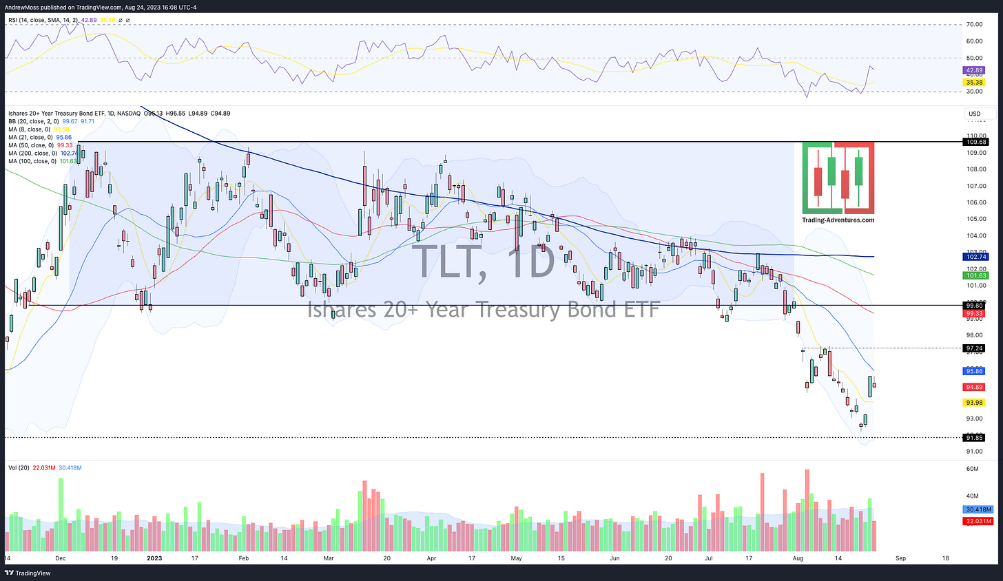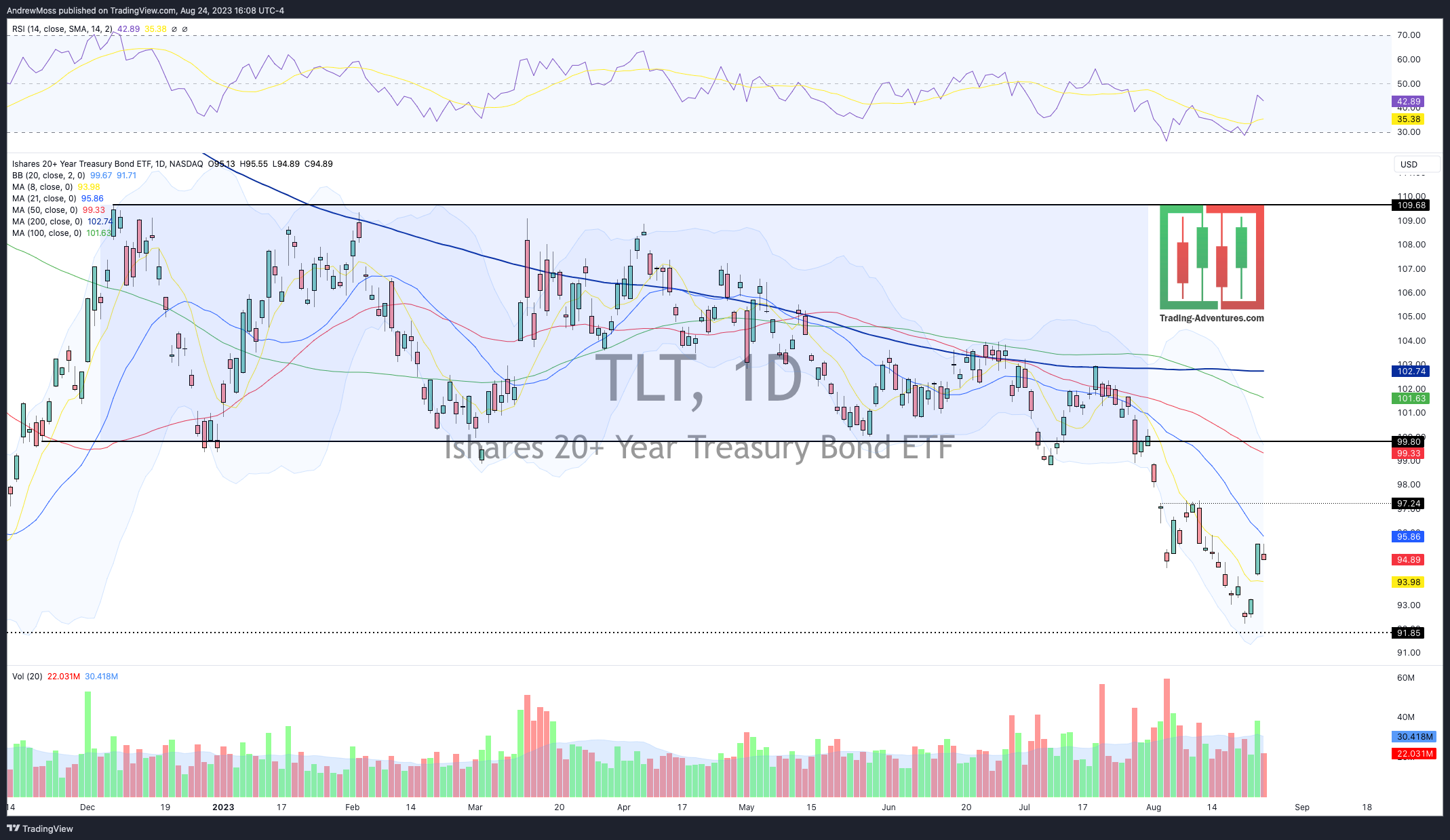 TLT Bonds were able to bounce from weekly support and, while lower today, appear to be holding up okay. Next overhead is the 21-day MA at $95.86 and a pivot level near $97.