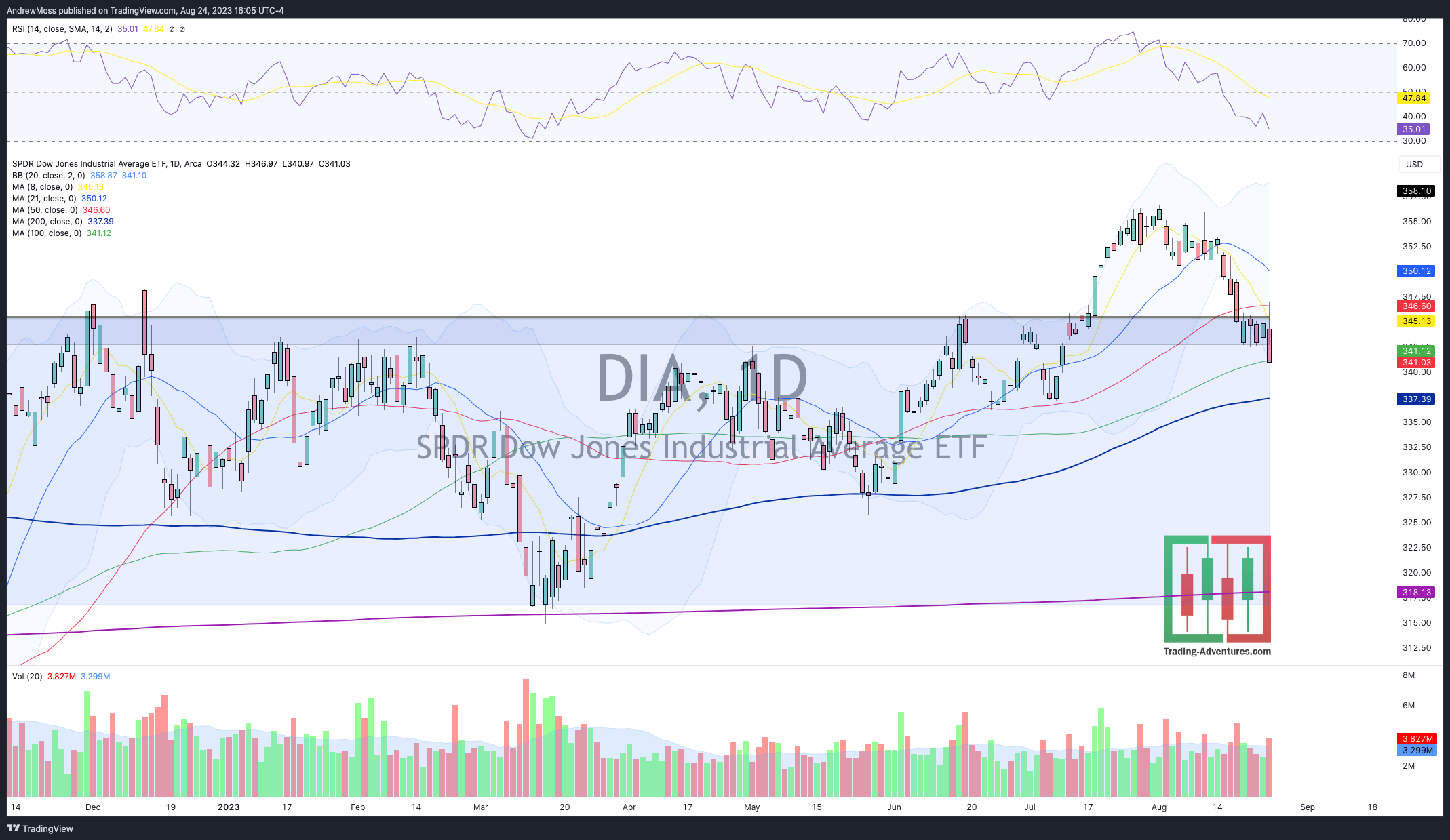 DIA is back in the wide, yearly range, below recent lows, and looking more and more like the mid-July to mid-August rally was a failed breakout. It closed just beneath the 100-day MA and has a bear flag in play. Caution.