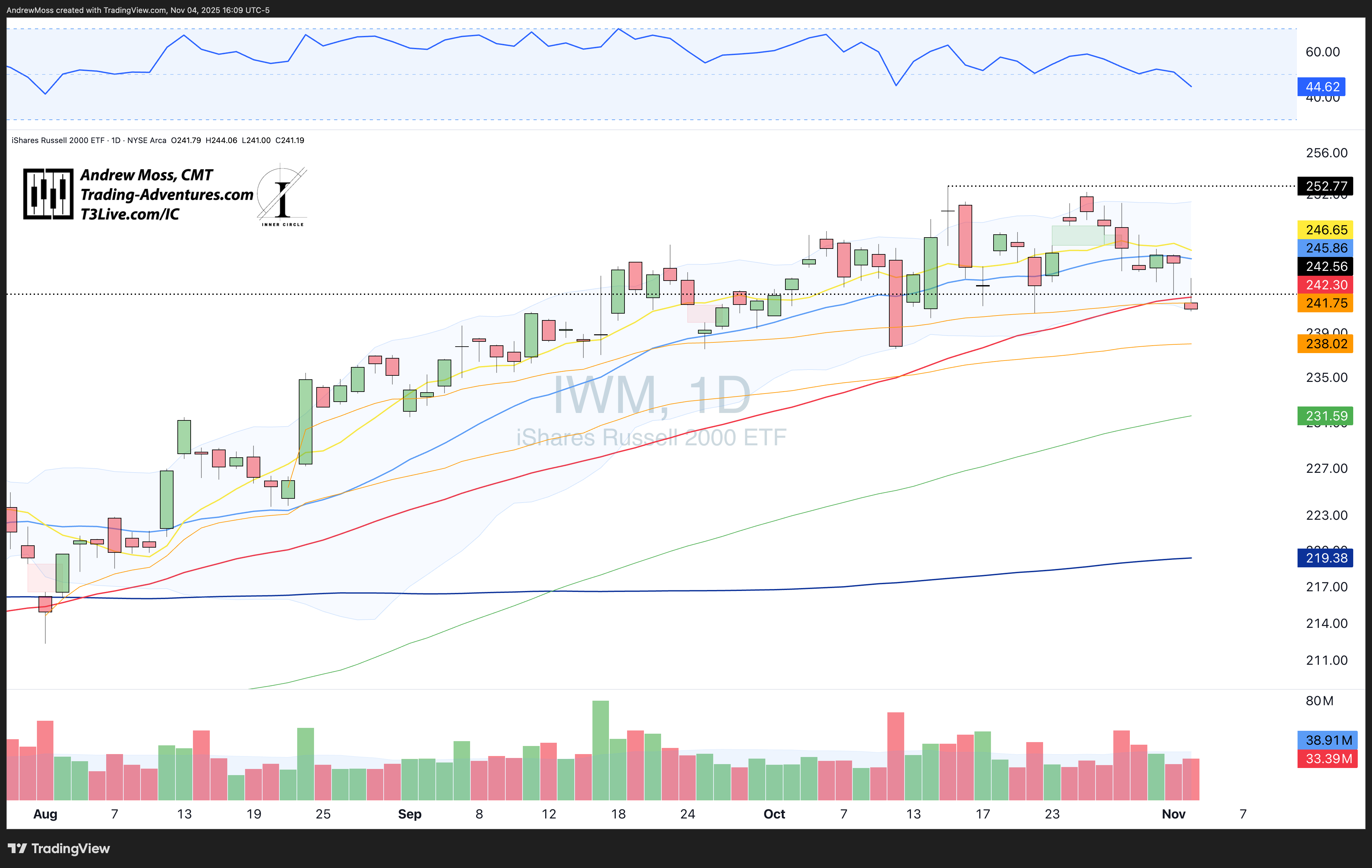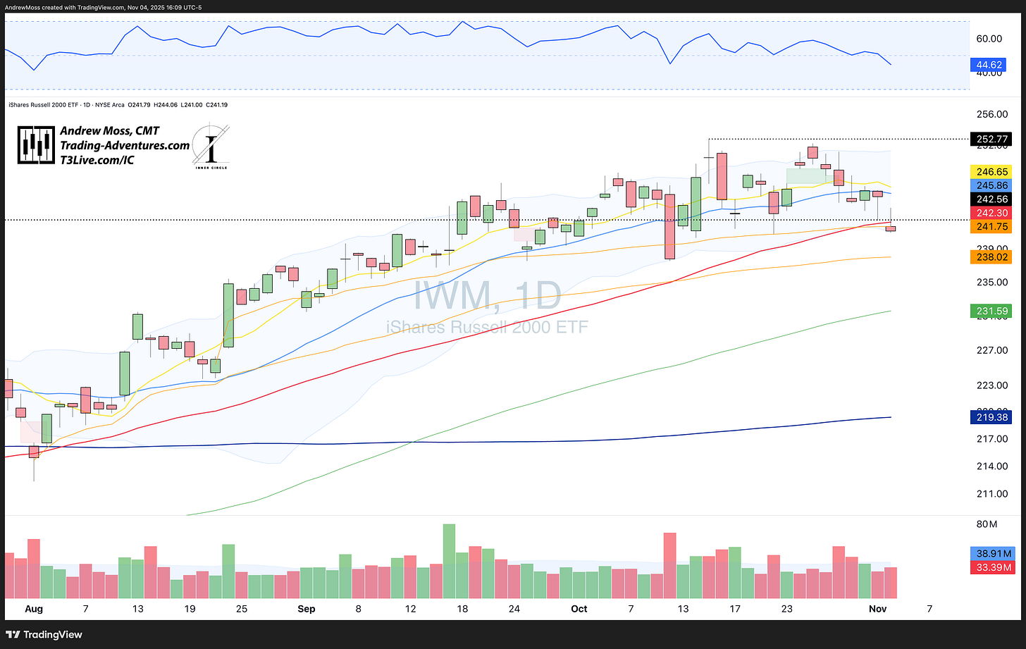 IWM has fared worst, dealing with a smoother and steadier decline that has taken below the 8, 21, and 50-day MAs.