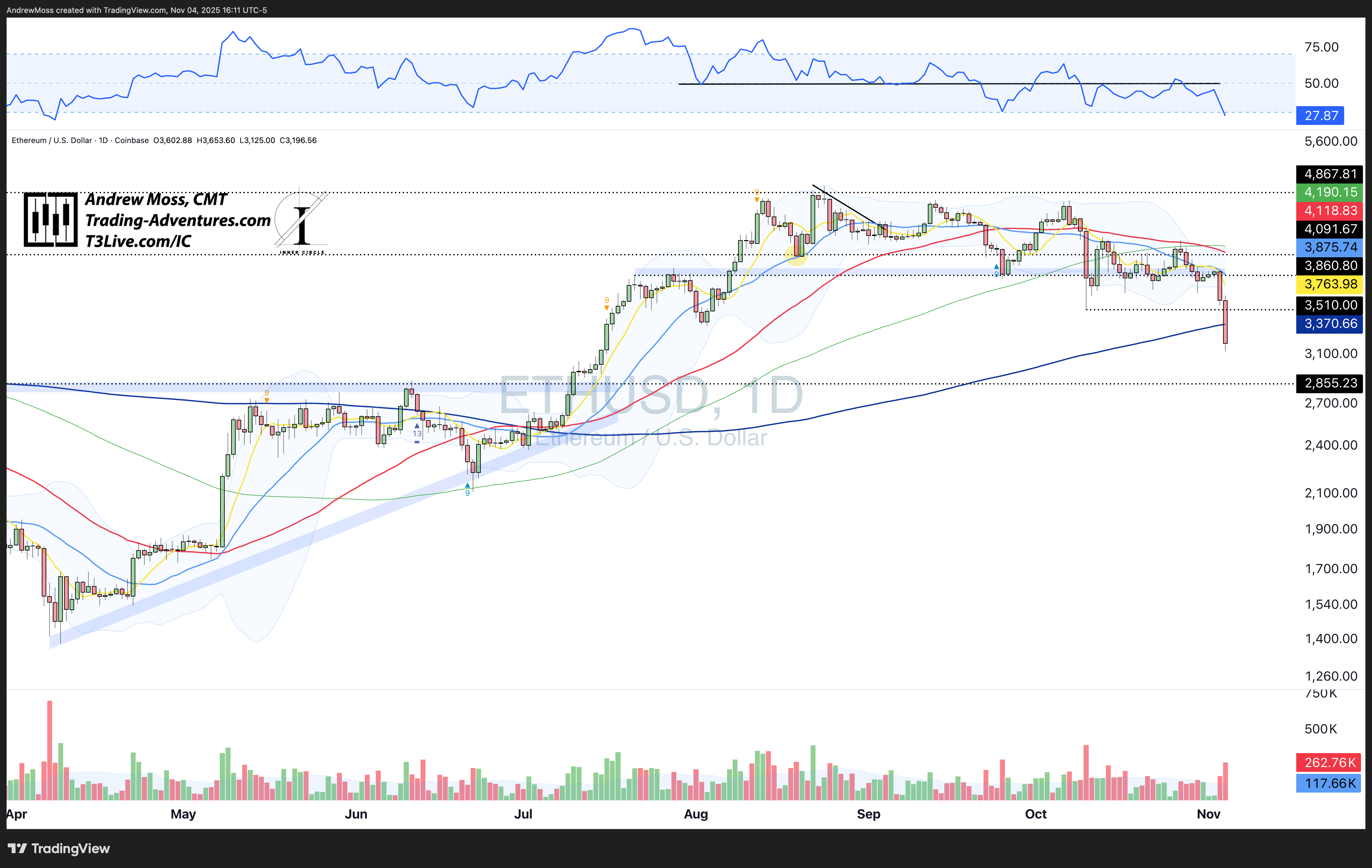 ETHUSD is also down sharply and is below all key MAs. There is a pivot at $2855 for potential support. Testing that level would mean a -42% move from the August high — a reminder that cryptocurrencies are still swift and volatile movers.