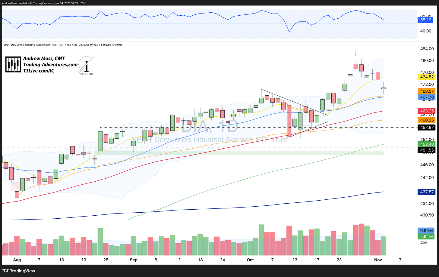 SPY settles back between the 8 and 21-day MAs while still holding above the October highs. Short-term momentum has been extinguished. But this is far from being a broken chart.