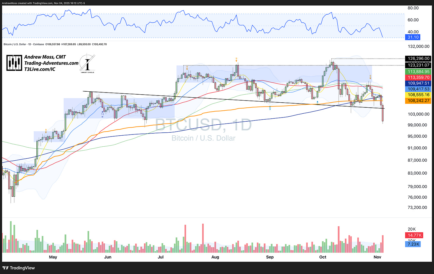 BTCUSD has endured two days of relentless selling. It has lost the 200-day MA and all other key MAs. It’s down -14.5% from the late October pivot high and -21% from the all-time high.