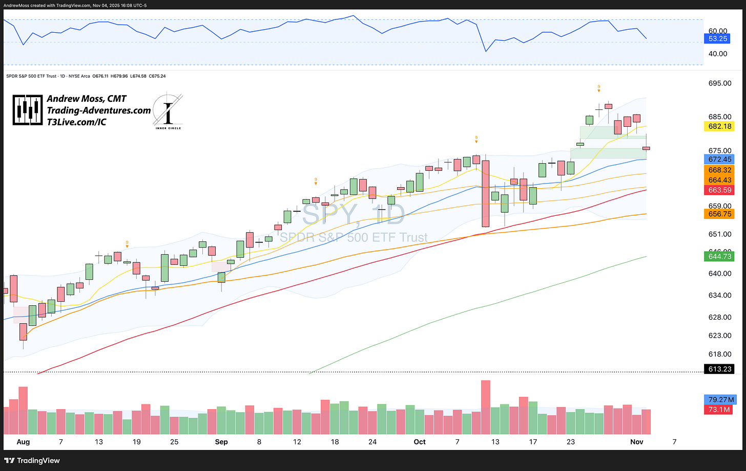 SPY printed a doji just under an extension level, signaling indecision or exhaustion.