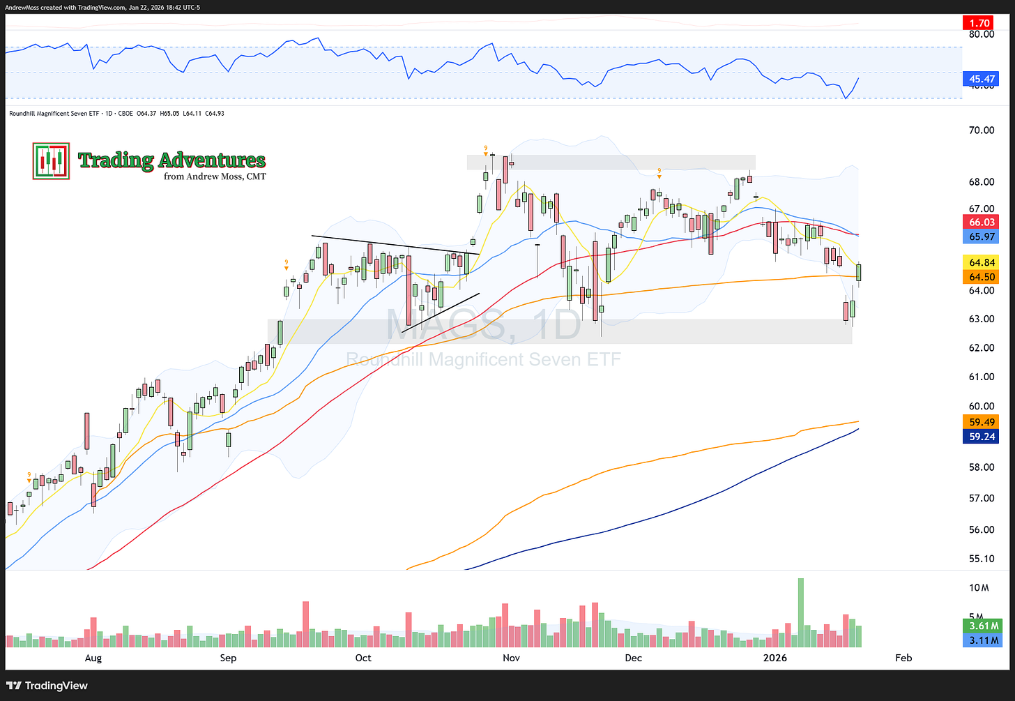 The Mag7 also jumped ahead leaving two days of selloff and consolidation behind and isolated with a gap on each side. It’s a start, but the 8, 21, and 50 day averages are all still declining and likely to provide a challenge for any further advance.