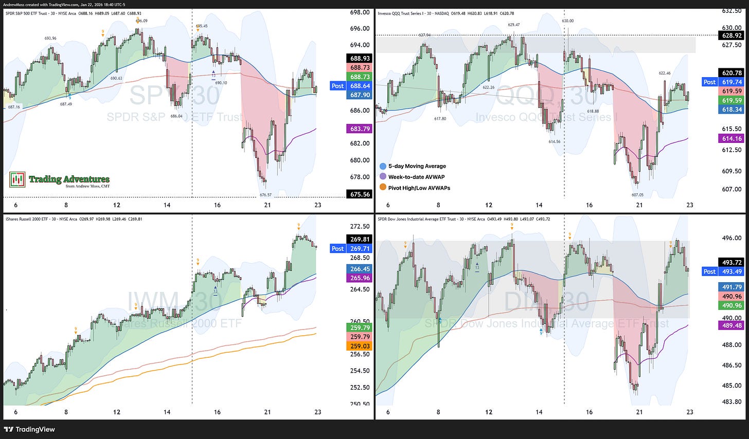 The sharp selloff has been largely recaptured, leaving the two headline indices just above their mostly flat 5-day moving averages and year-to-date anchored VWAPs. So they’ve made progress, but so far the roadmap is left in a state of indecision.