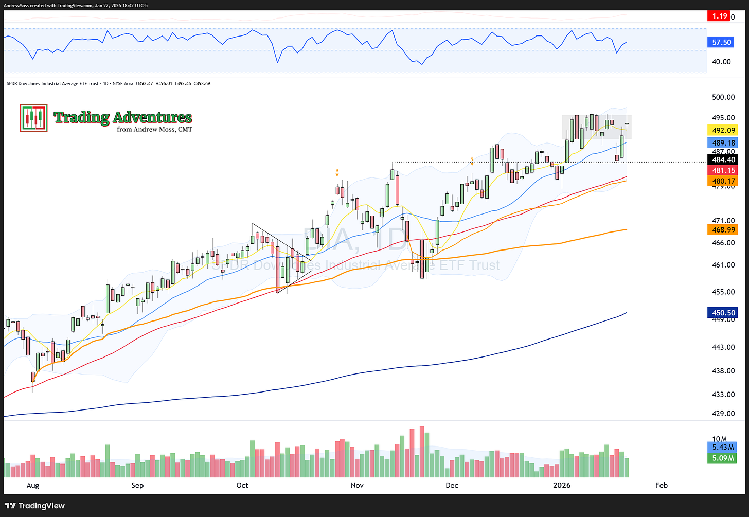 Meanwhile, IWM & DIA didn’t need any extra time to make up their minds. The small caps continue to show impressive leadership and resilience by hitting another new high today with the Dow 30 knocking on the door.
