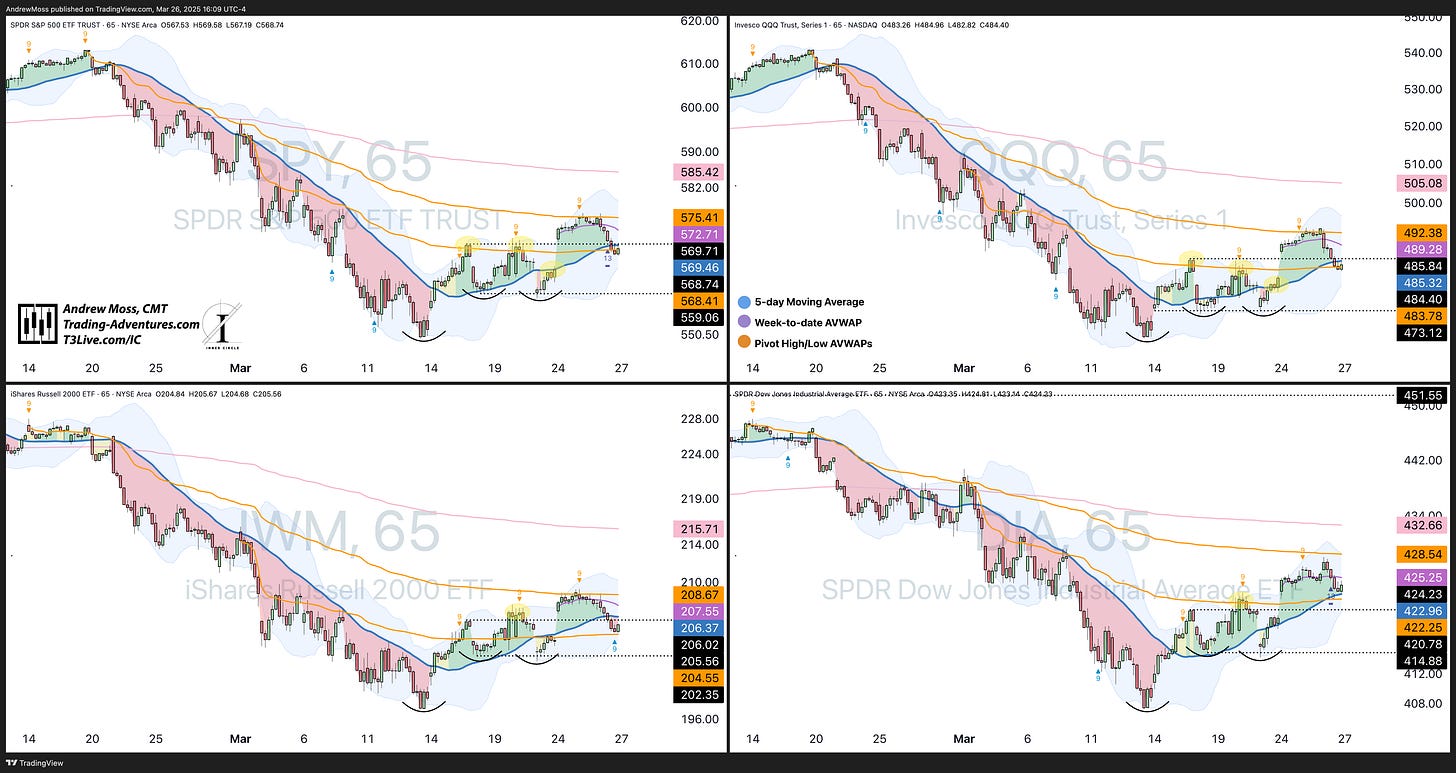 The move did take prices above the AVWAPs from the pivot highs made in early March. But they quickly found resistance at the AVWAPs from the all-time highs made a couple of weeks prior. Furthermore, prices on 3 of 4 indexes are now back below the 5-day MA.