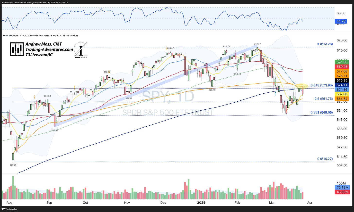 SPY had a significant test near $575, as my friends Steve Strazza and Michael Nauss pointed out, not only in the AVWAP from the highs, but also with a number of other issues. (Both are very active on X.com and their own webpages, which are linked below. Definitely add them to your regular reading lists.)