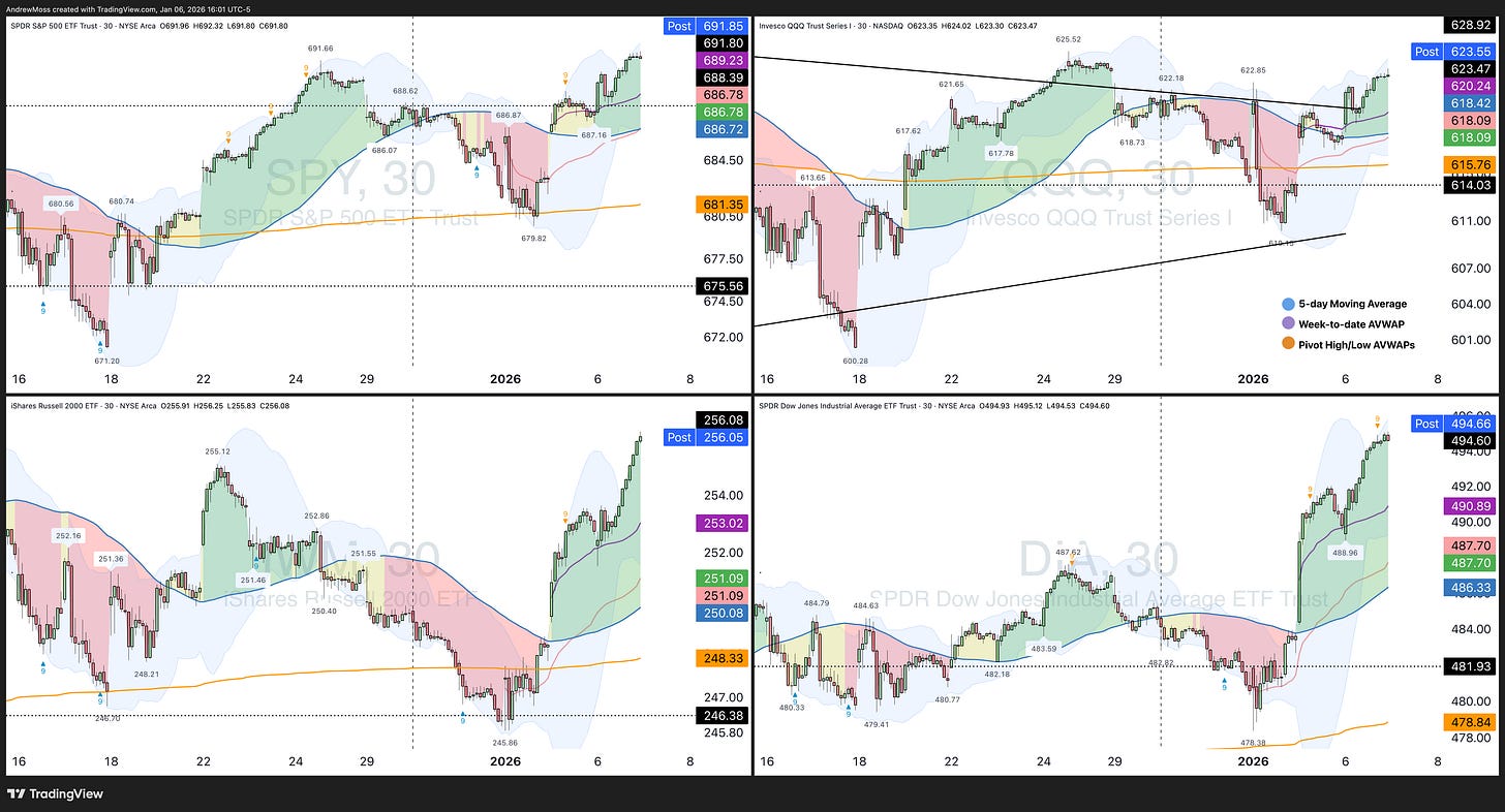 Our ‘roadmap’ chart shows green lights across the board with all four major indices making higher highs and higher lows above rising 5-day moving averages.