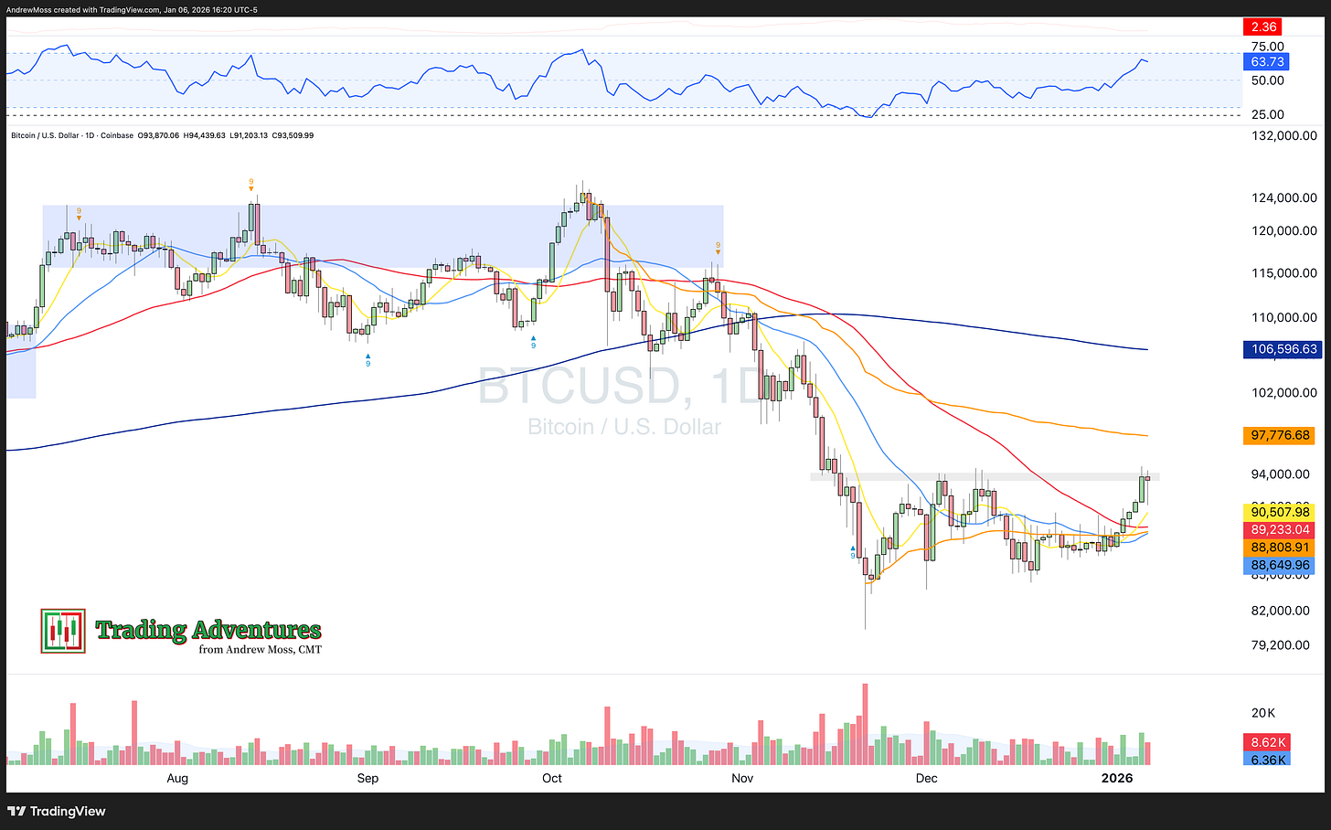 Price is entering a prior resistance zone near $94,000, with the anchored VWAP from the all-time high (~$97,776) as the next key level above.