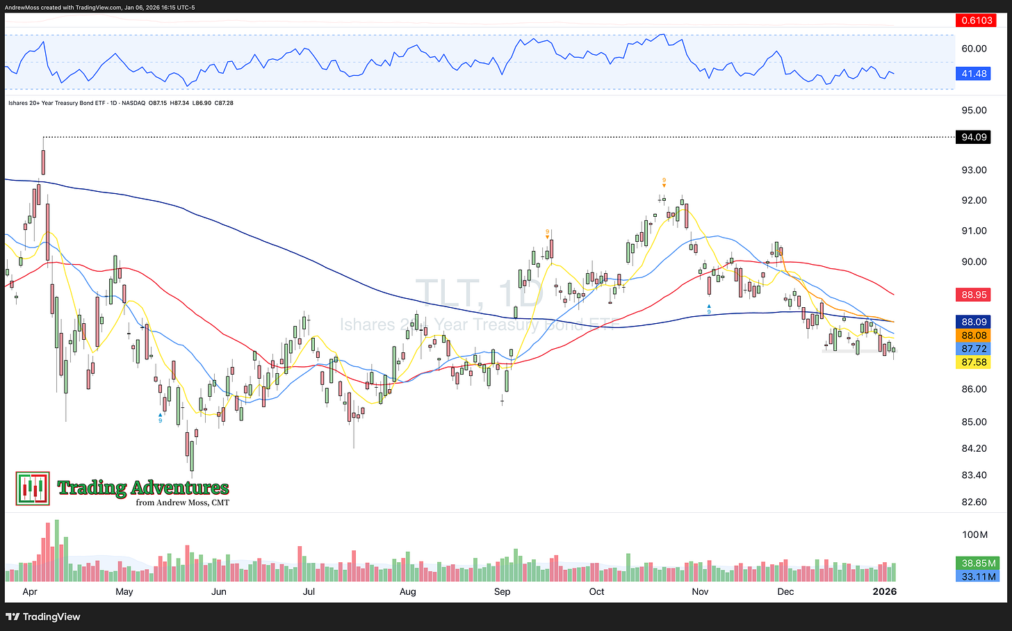 TLT did not join the move. Price is below all key moving averages — each of them declining — and RSI remains below 50.