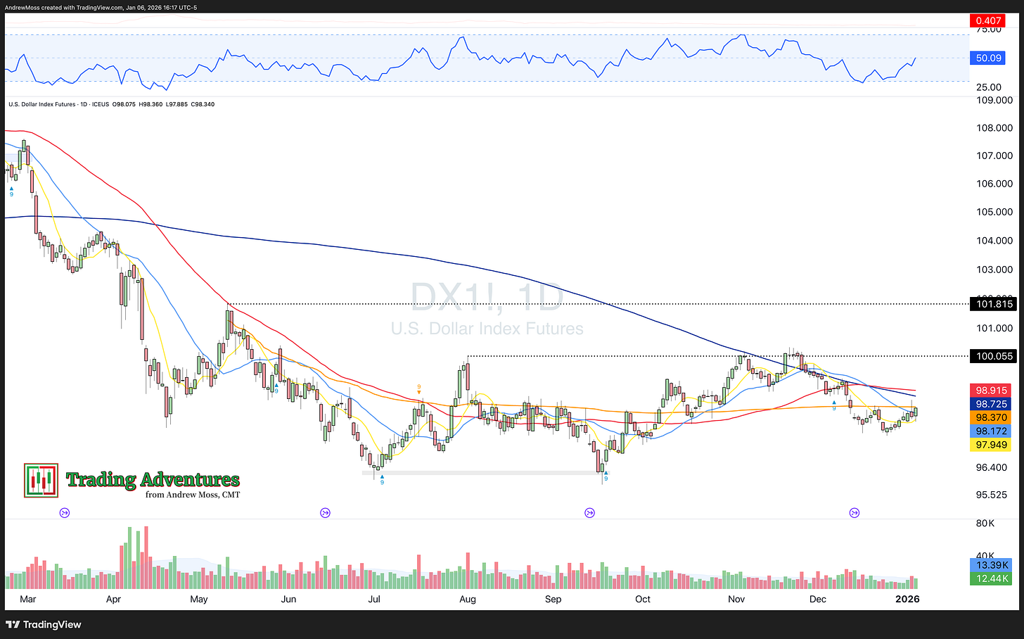 DX1! Dollar futures are attempting to stabilize, reclaiming the 8-day and 21-day MAs, but the anchored VWAP from the May 24 high continues to act as resistance.