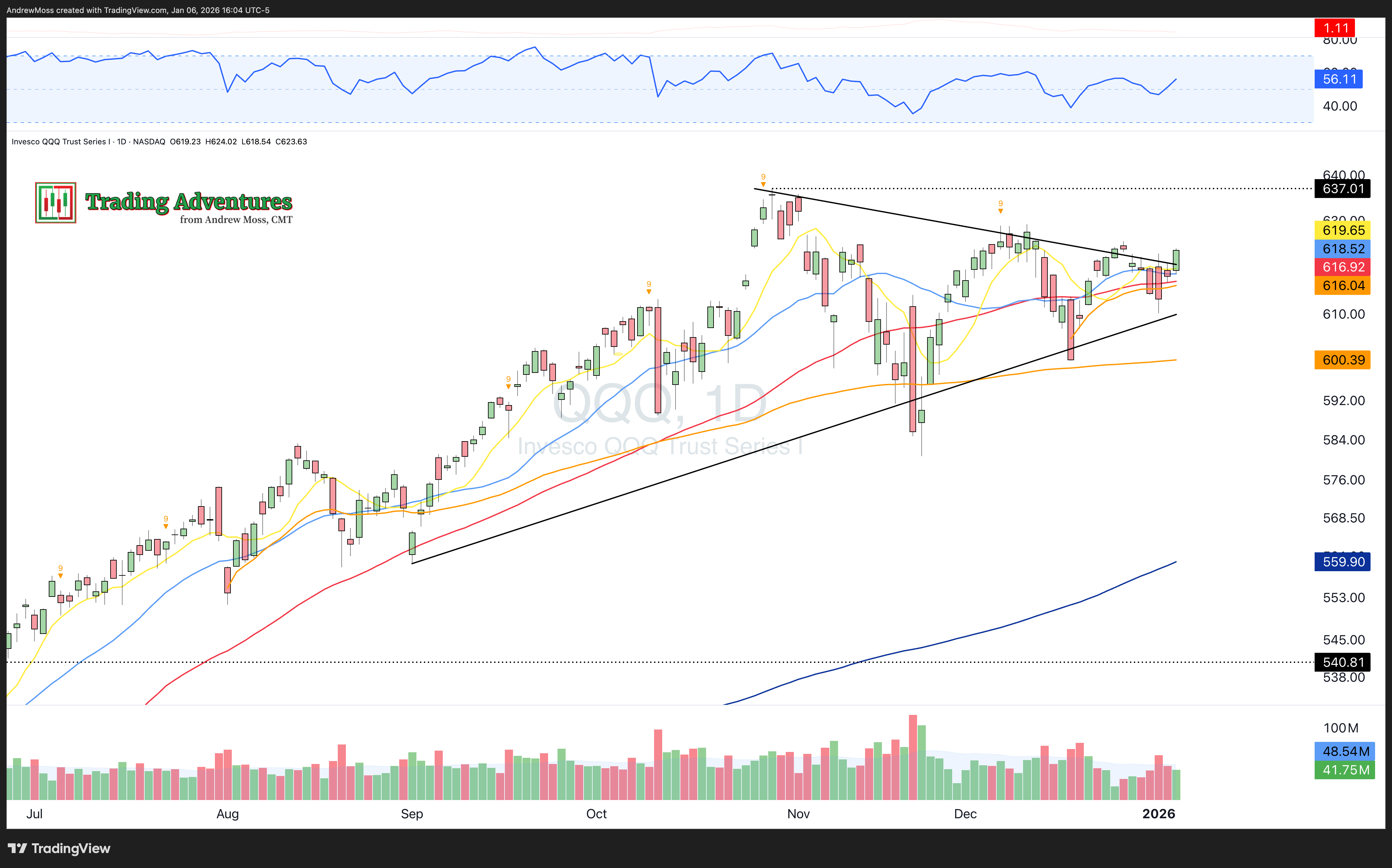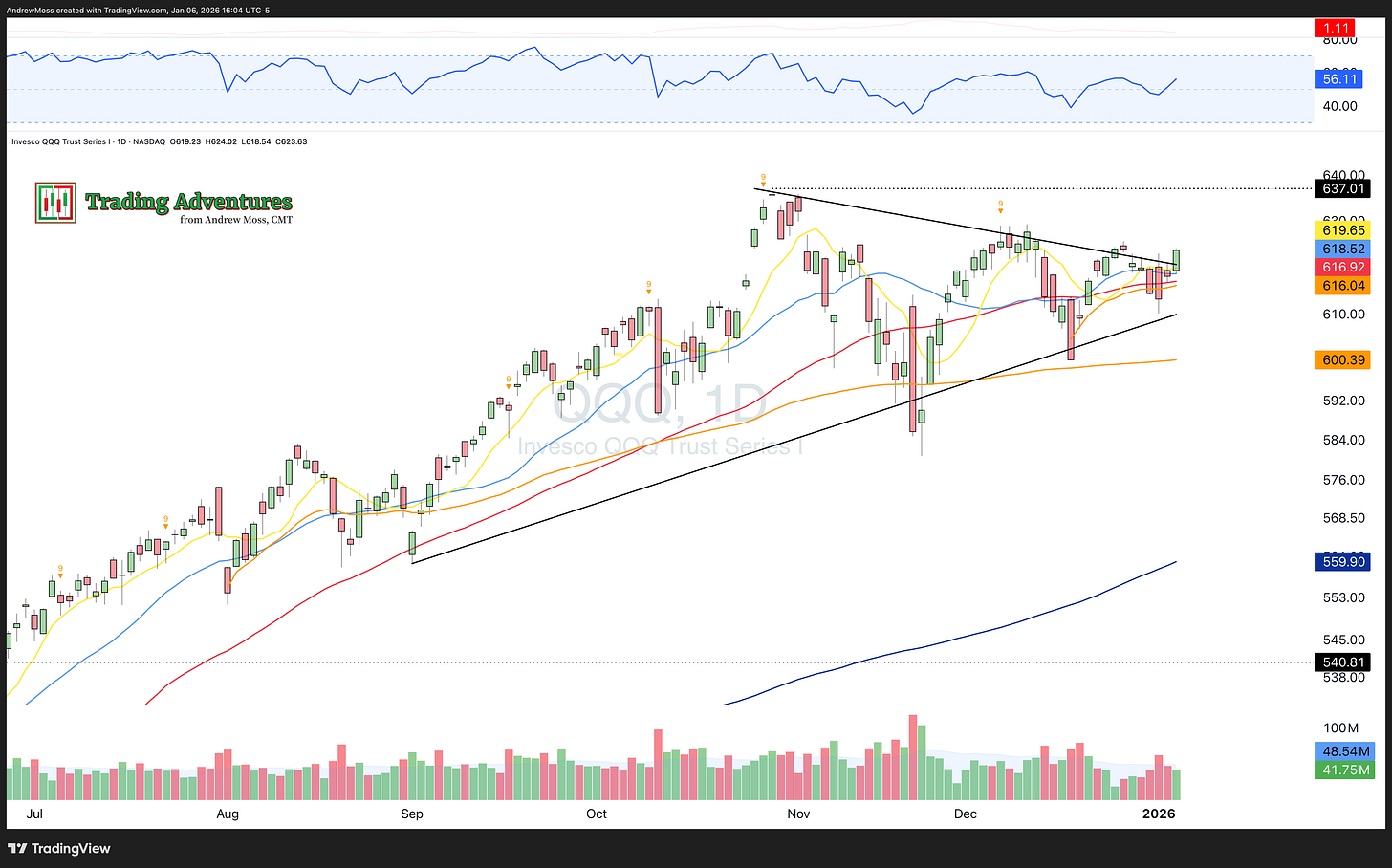 DIA pushed to a new all-time high, with RSI nearly tagging 70.
