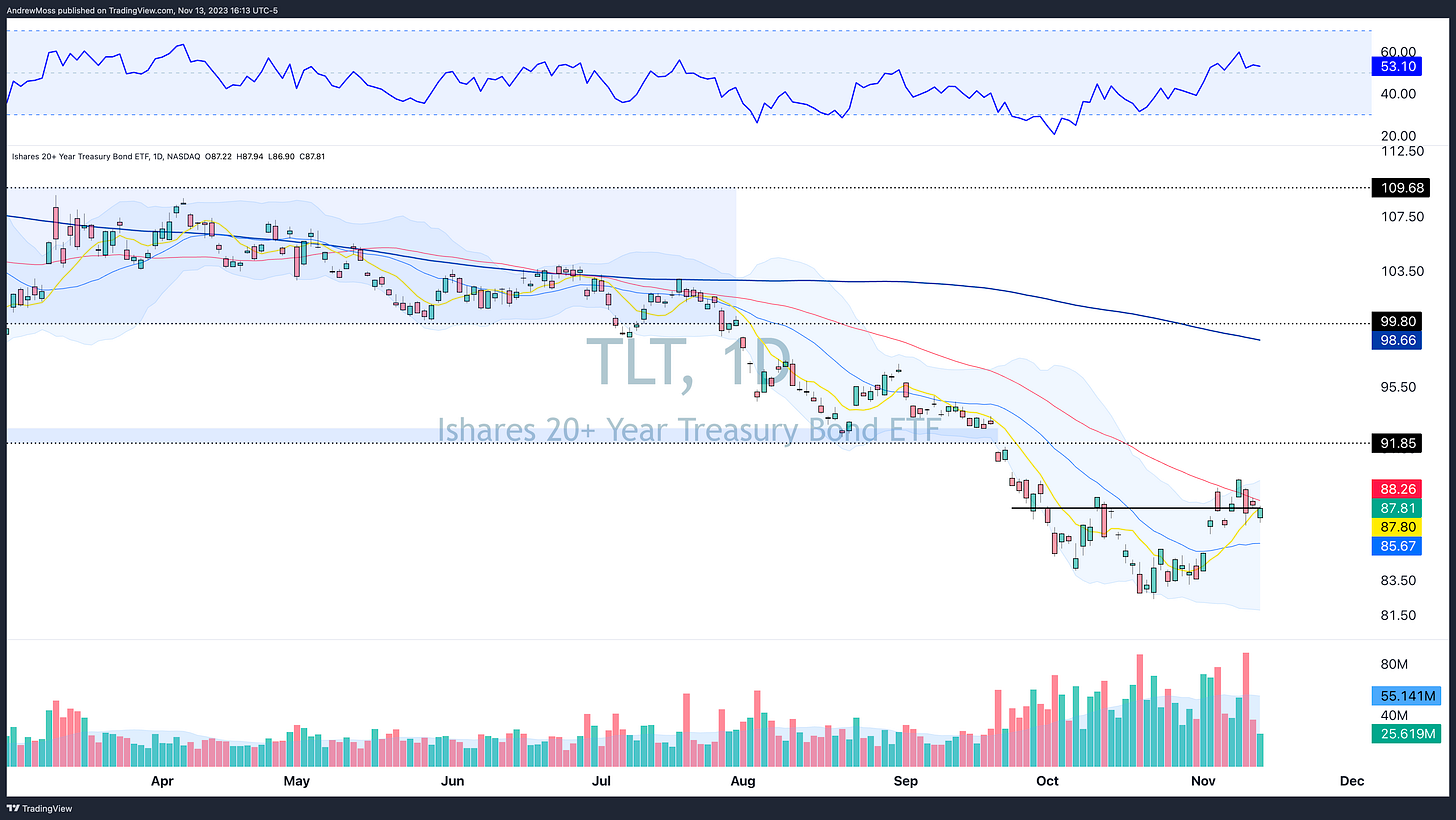 TLT continuing with mostly sideways movement adds to the case that we may be seeing a bottoming process in action.