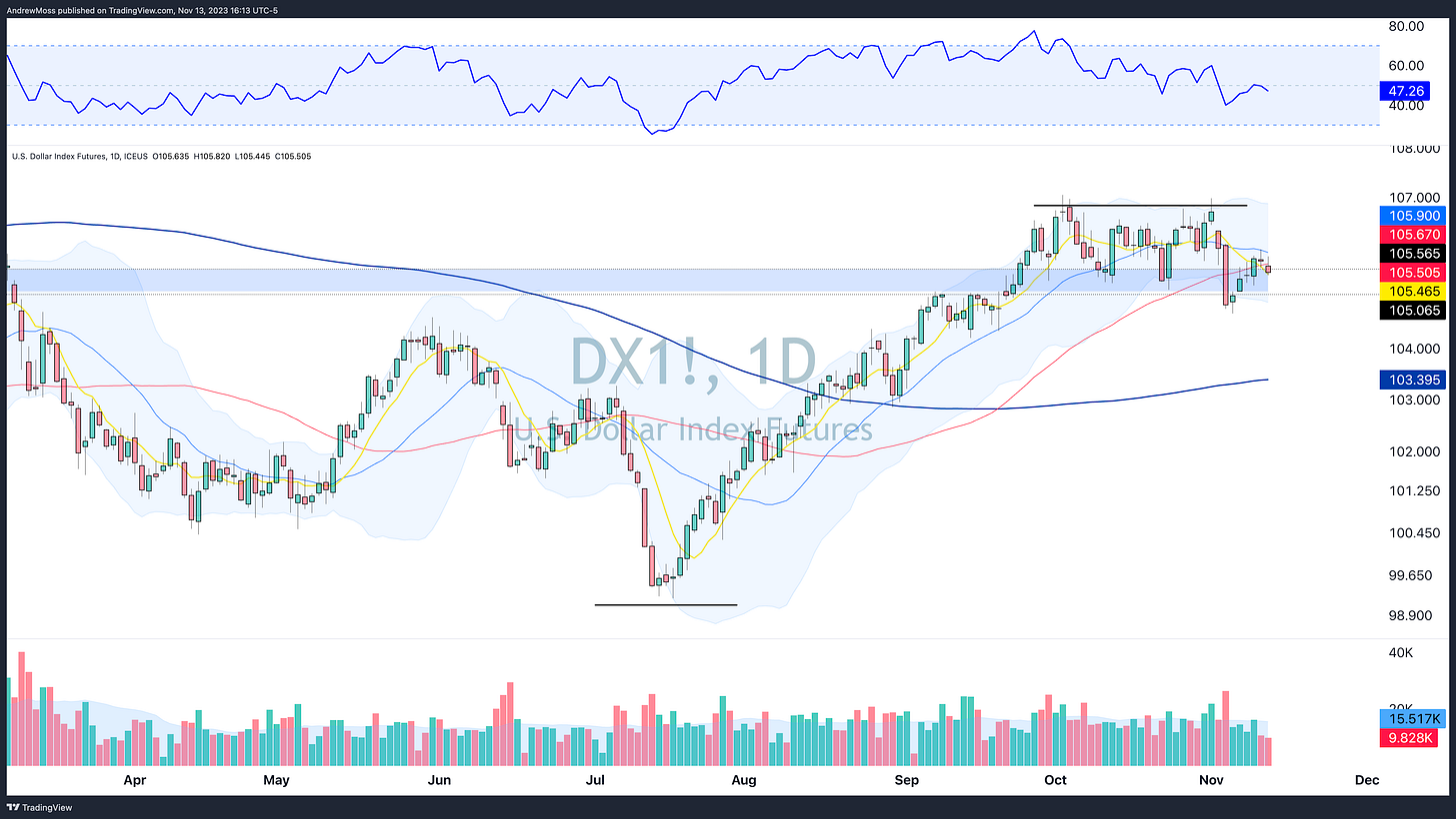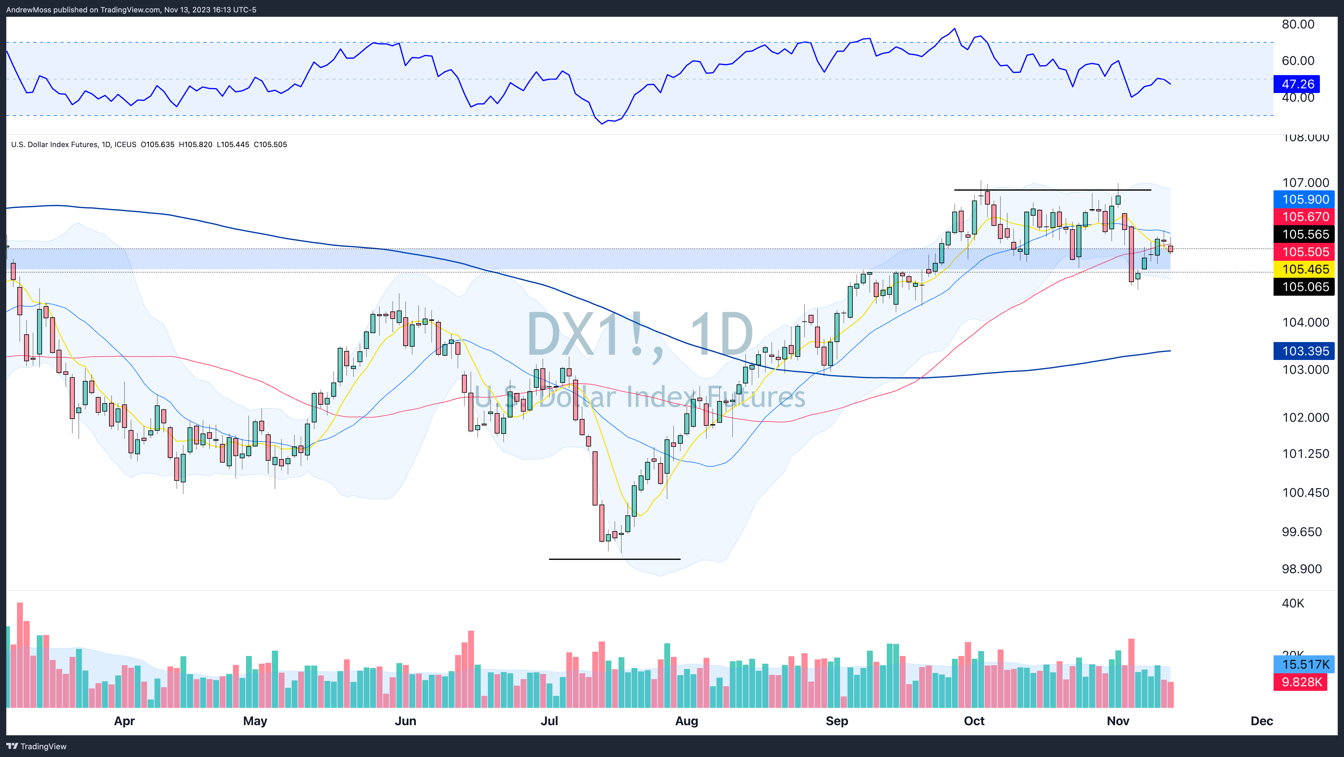 DXY The Dollar could be in the early stages of a bear flag breakdown. Watch Friday’s high and the 21-day MA above and last Monday’s low underneath.