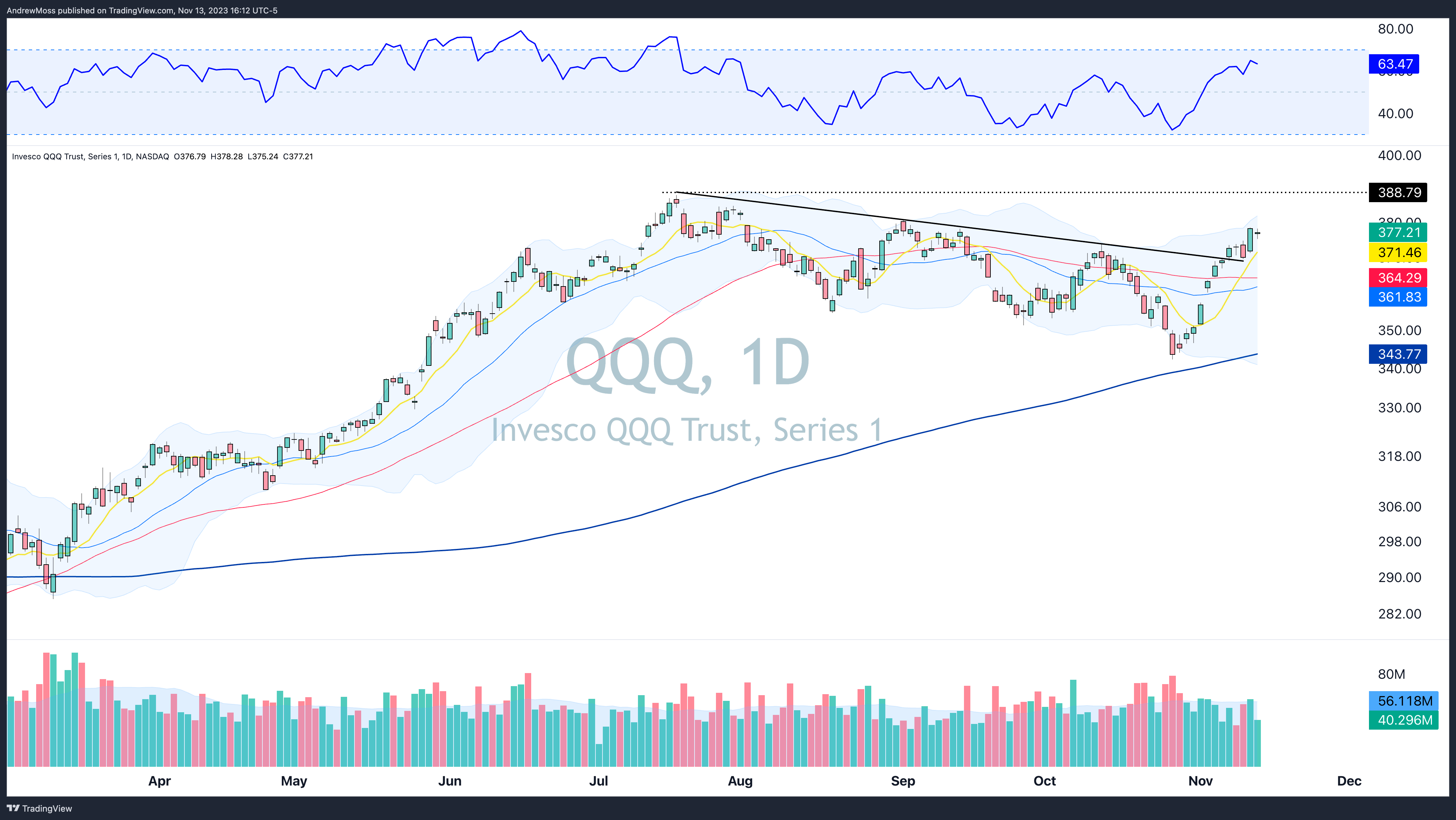 QQQ keeps passing its tests with persistent, methodical buying. New highs aren’t far away.