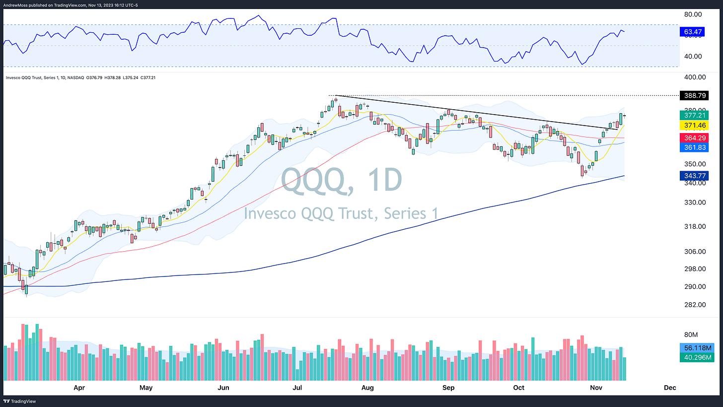 SPY is through the shaded resistance zone and into another trendline. Notice it has made a slightly higher high on each of the last six days. The moving averages are mostly pushing higher - only the 50-day still has a negative slope. RSI is far from overbought. The technical picture says to look for a continuation higher.