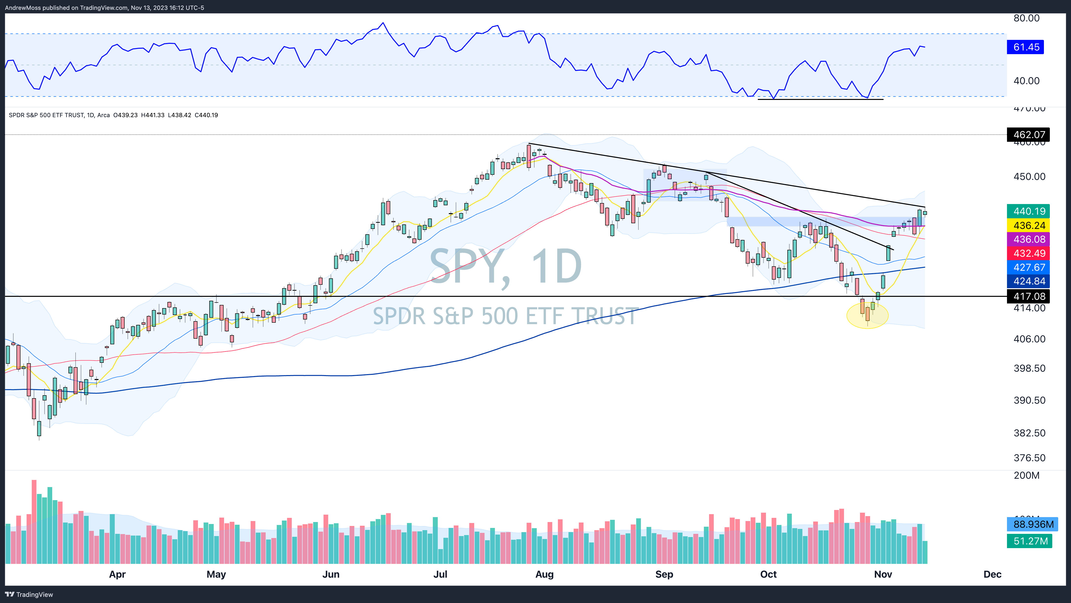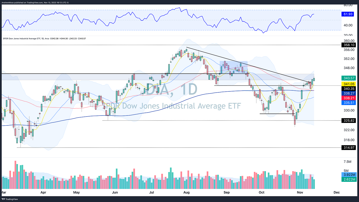 DIA has broken over the trendline and back into a significant support/resistance zone.