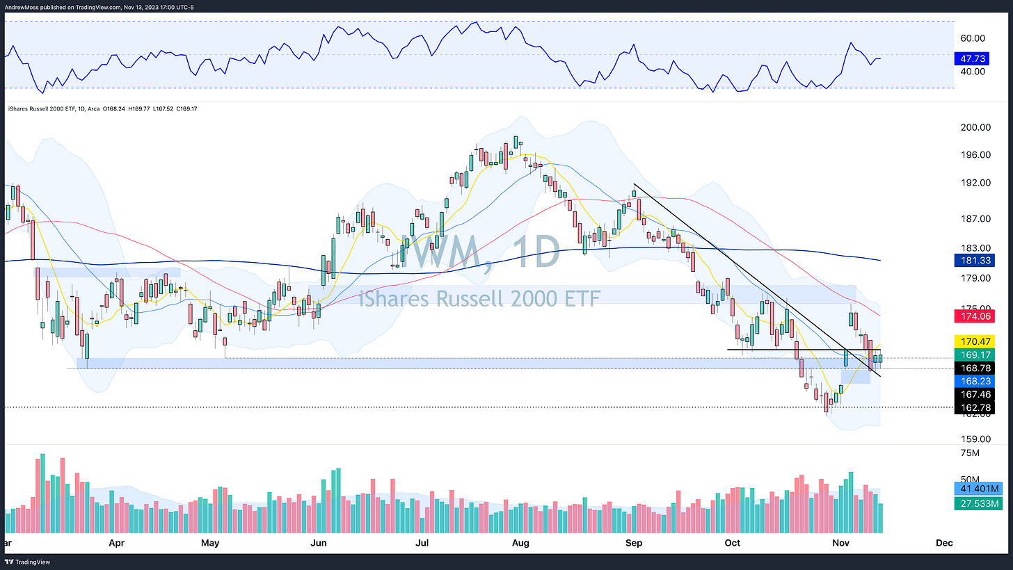IWM will go down, but it won’t stay down. However, it’s a long way from winning the fight. A successful retest of this downtrend breakout followed by a move beyond the 8-day MA near $170 and the 50-day near $174 score a few rounds in its favor.