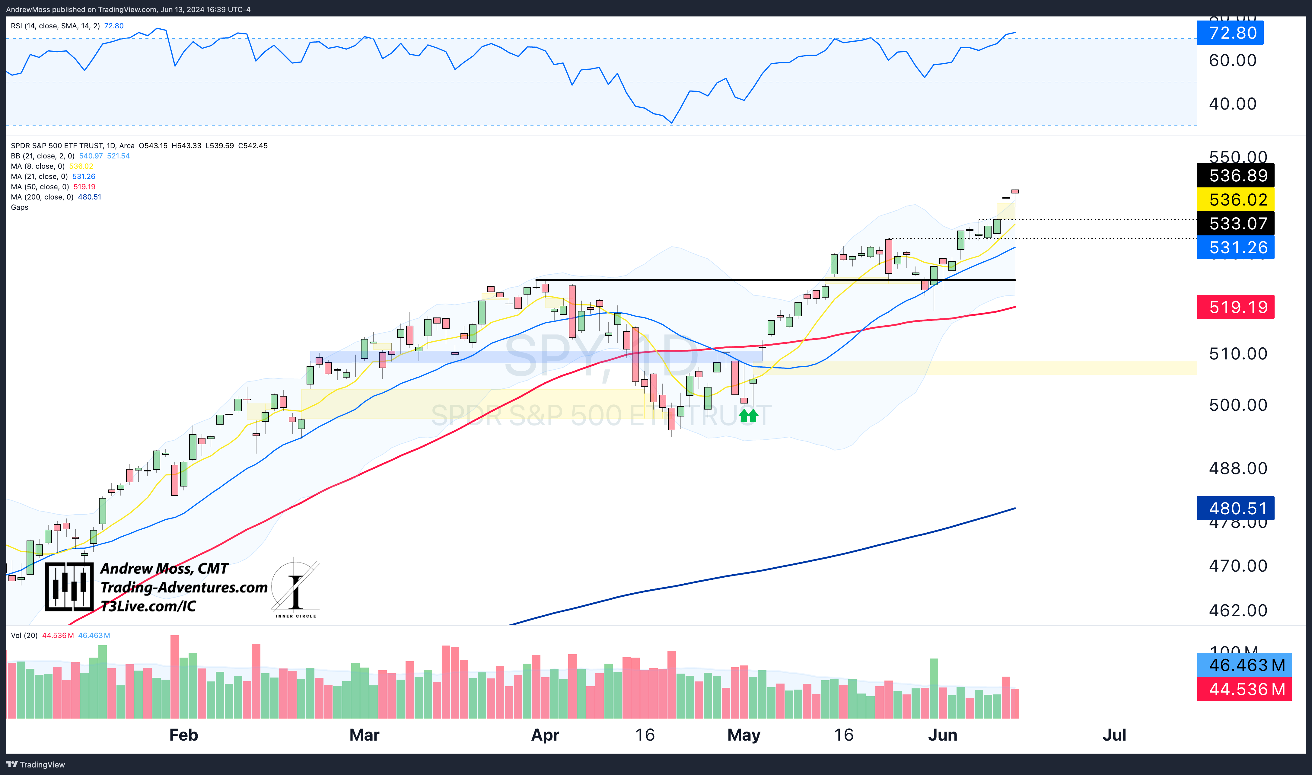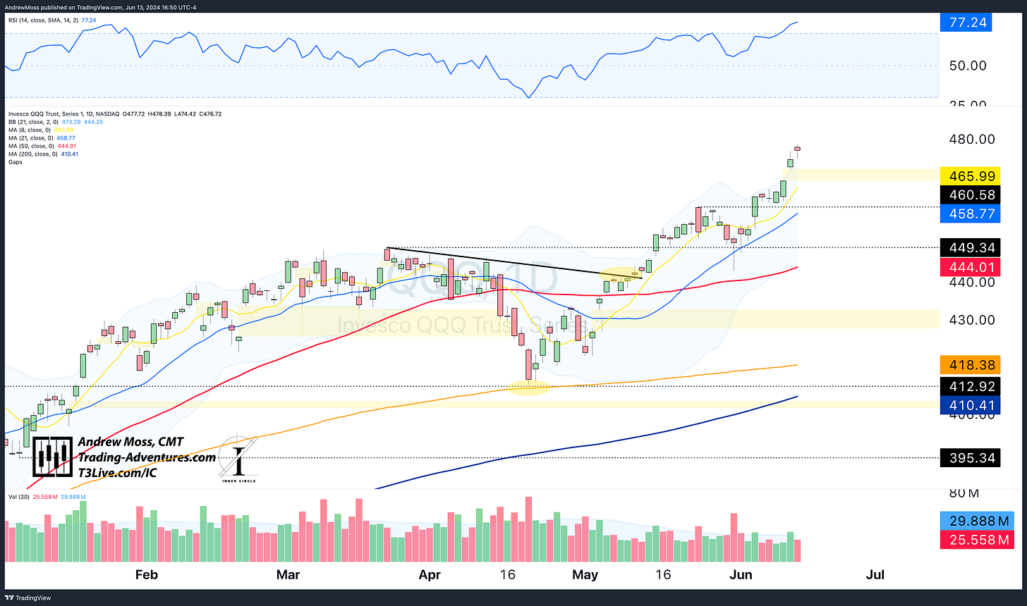QQQ is more extended above the 8-day, and the RSI clocks in at 77.24 today. A gap fill and 8-day MA retest is a potential here as well.