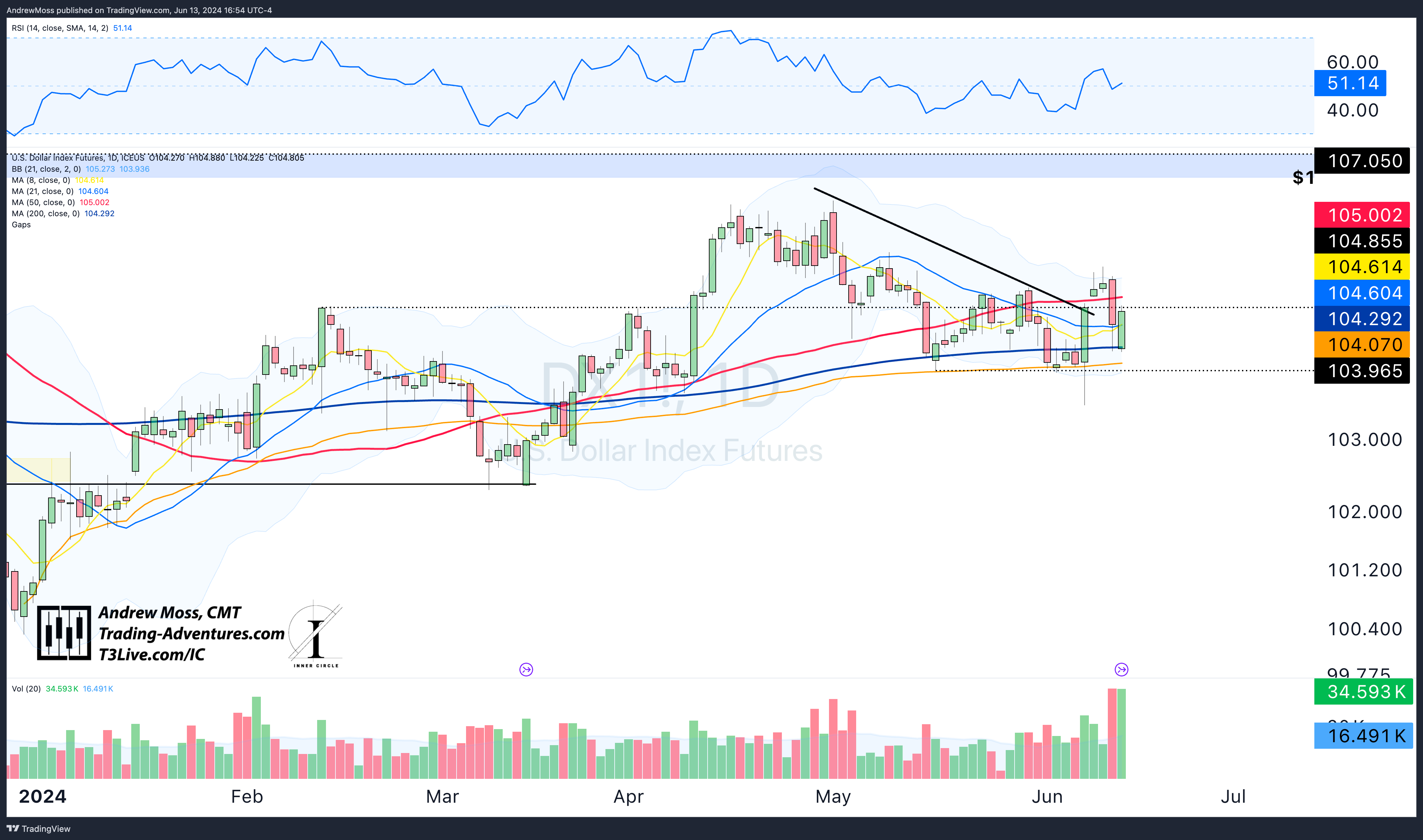 DXY is nearly as messy as IWM. A lot of movement just to come back into the range, and we’re still left looking for a move that keeps it below $104.