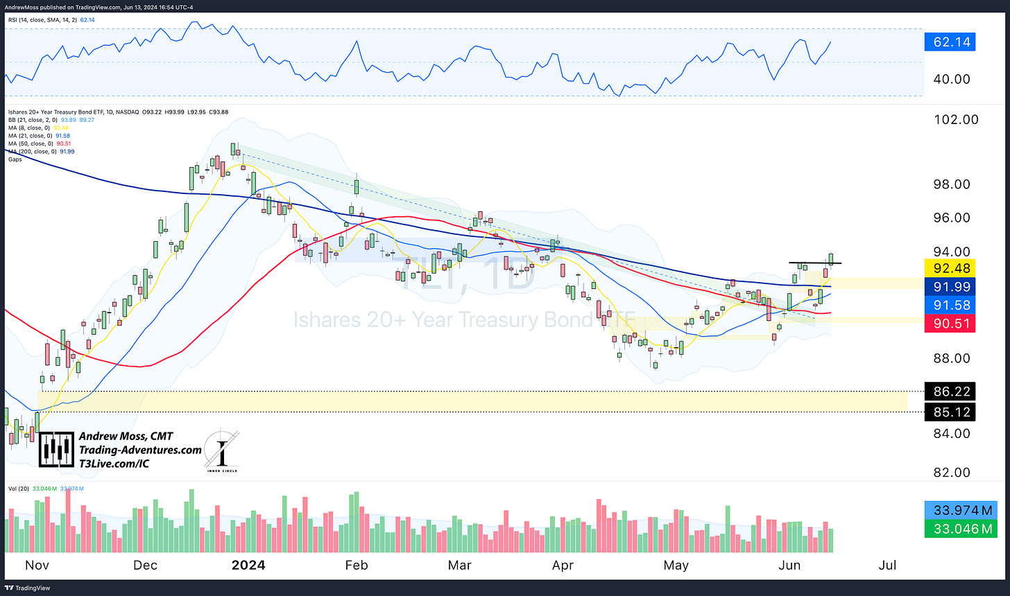 TLT continues to improve. Today, it's above the recent pivot and holding the gains well. The 8 and 21-day MAs are already moving higher, and now we can look for the 50 and 200-day MAs to do the same.