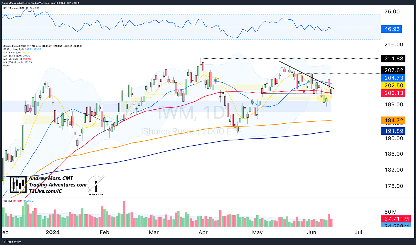 IWM is still a mess. Breakdowns don’t hold, and breakouts do not. The low $200s simply will not let go. It did manage to close above the support line and near the 50-day MA.