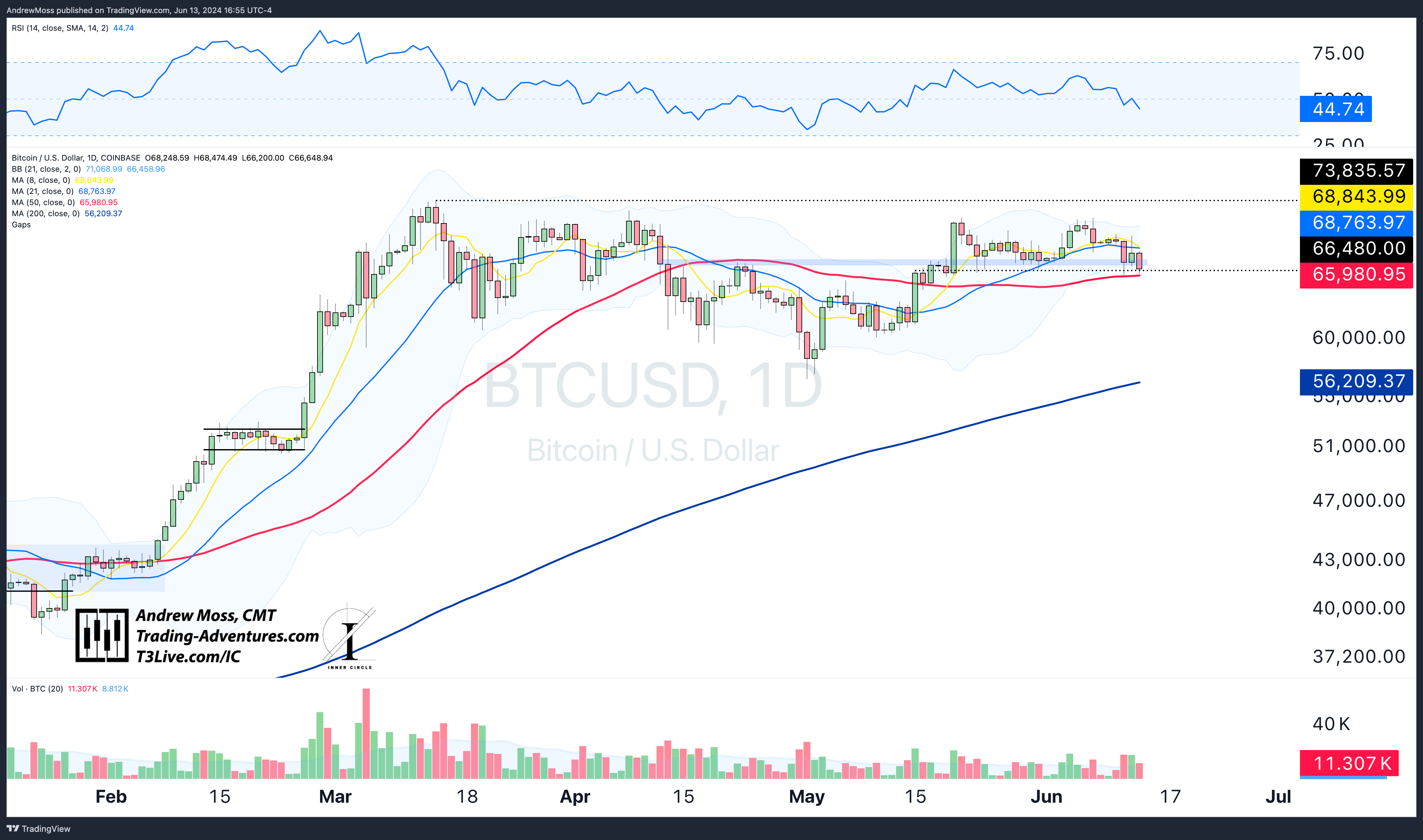 BTCUSD continues the holding pattern. The range over the last three months is still in control as price tests the 50-day MA this week. Above the redline, we will stay on breakout watch. Below the redline means ‘risk-off’ for the near future.
