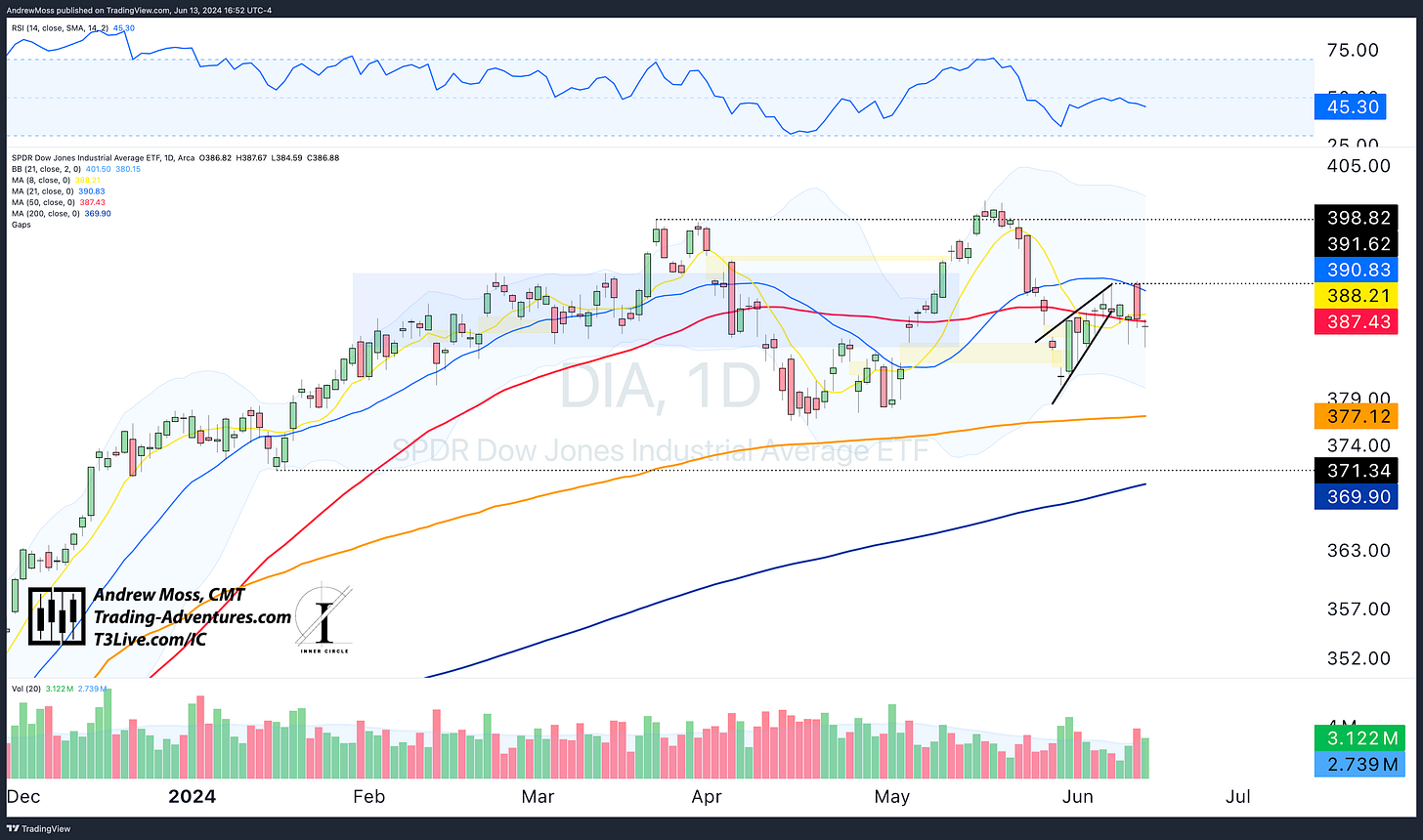 DIA was rejected squarely at the 21-day MA, and now the bearish rising wedge pattern has more merit. If it doesn’t recapture the $391.62 pivot fairly soon, a trip to $377-$378 is very possible for the Dow 30.