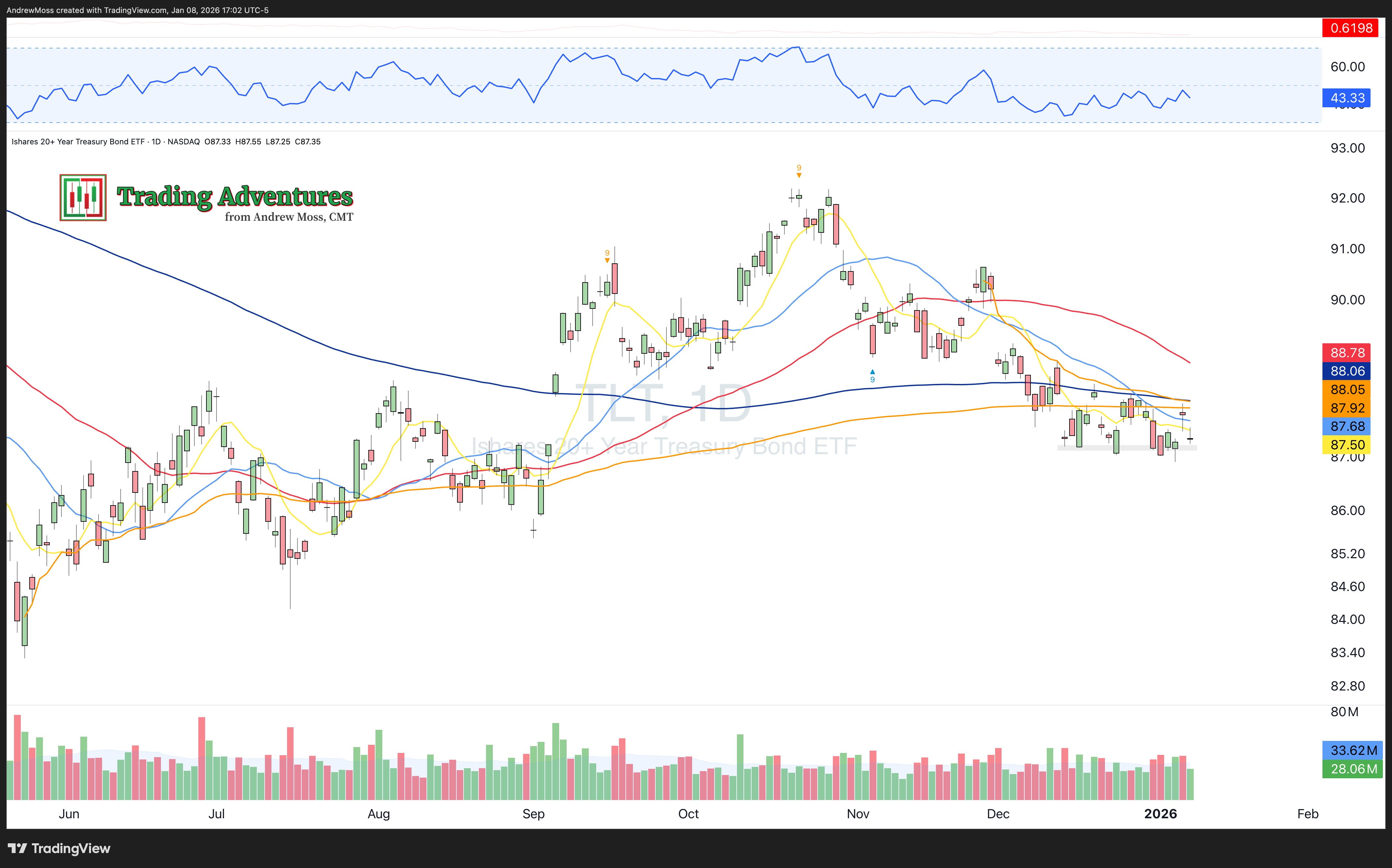TLT remains stuck below it’s moving averages as once again the brief rise (one day) failed to take the RSI above 50.