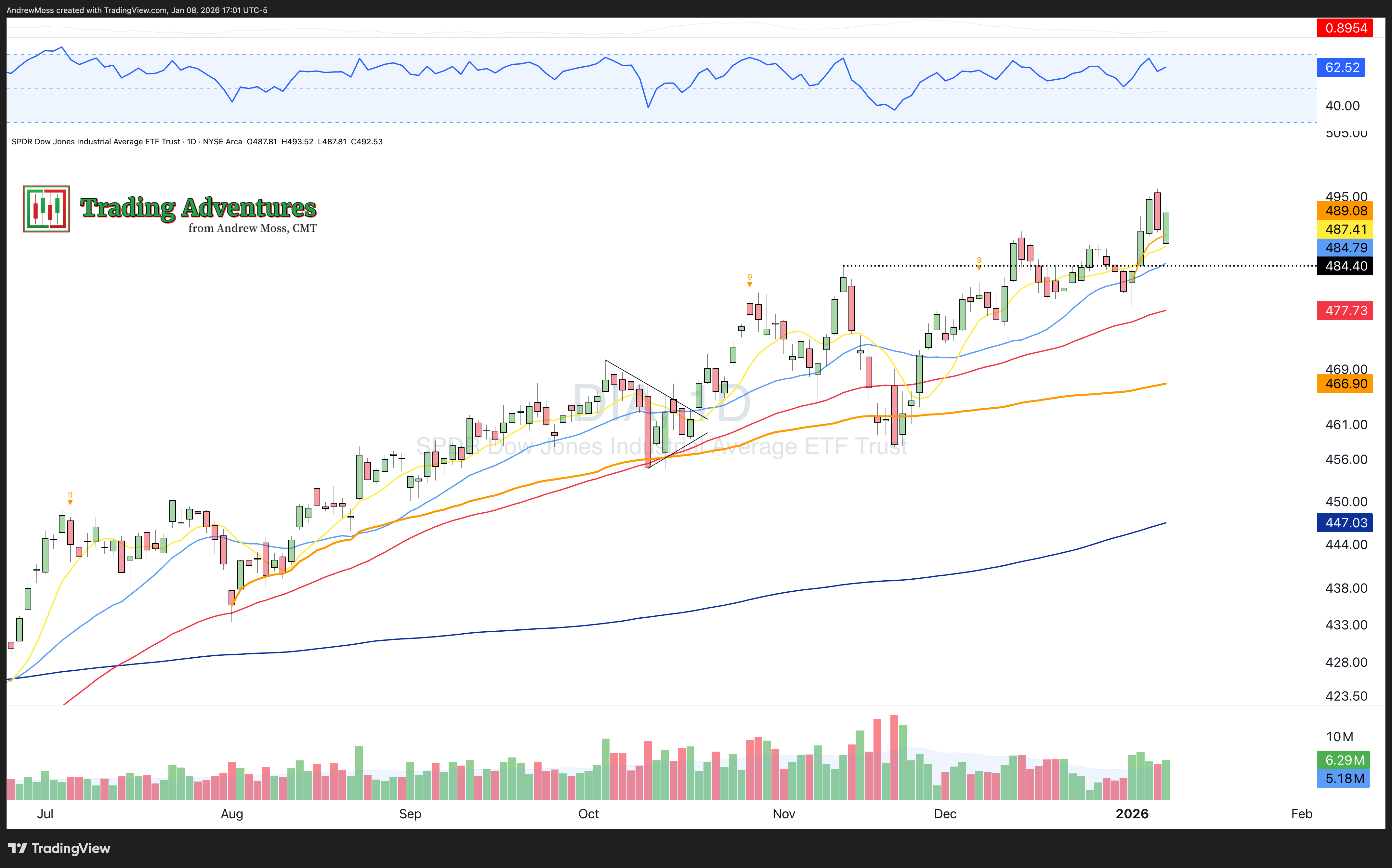 DIA bounced well after yesterday’s pressure. It too is above all key moving averages, which are rising in sequence.