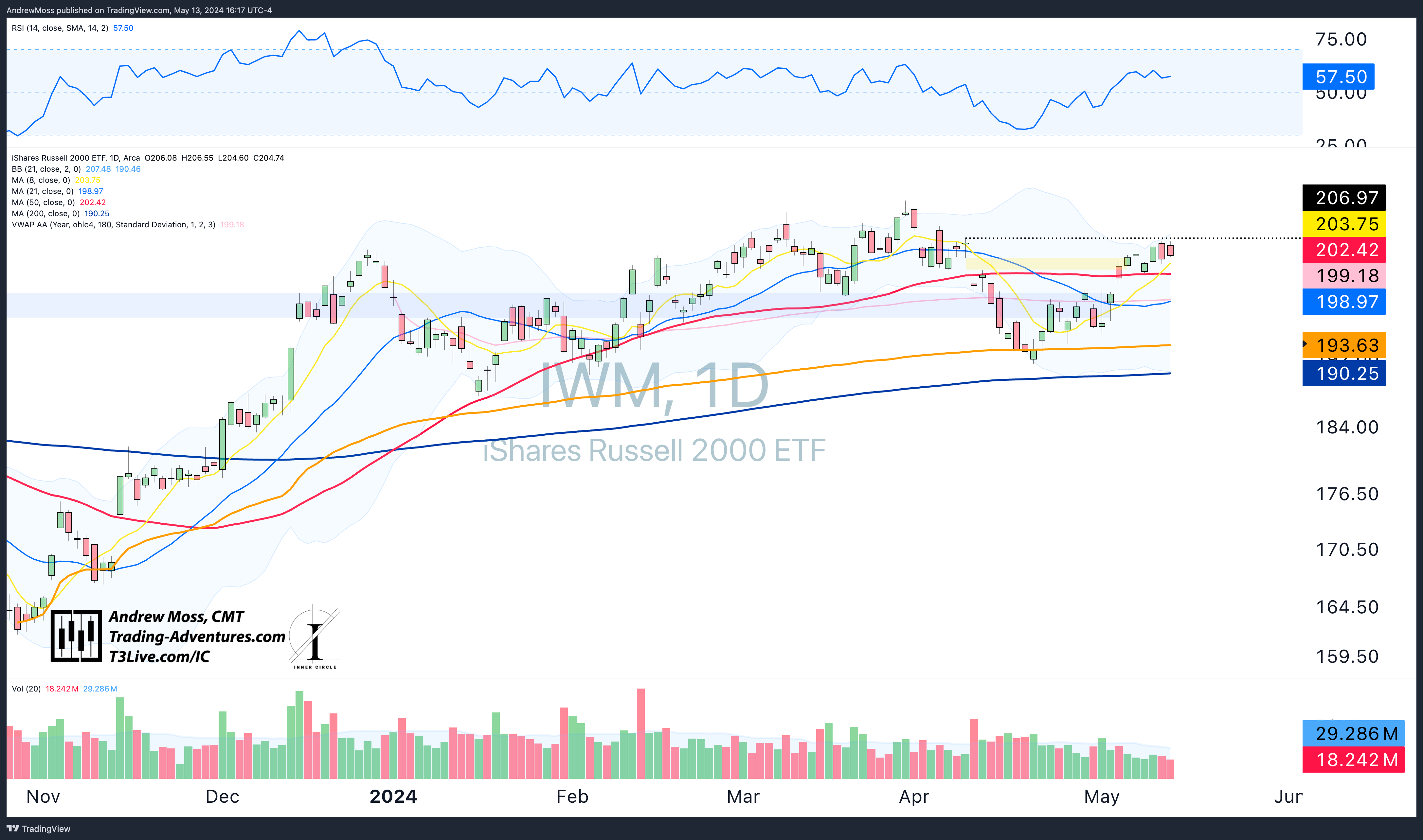 IWM printed an inside day with the 8-day MA continuing to rise underneath. It’s a bullish consolidation so far. Good economic news should help it clear the $206.97 pivot and improve the chart more. A bad reaction would likely result in a test of the 21-day MA and YTD AVWAP, both near $199.