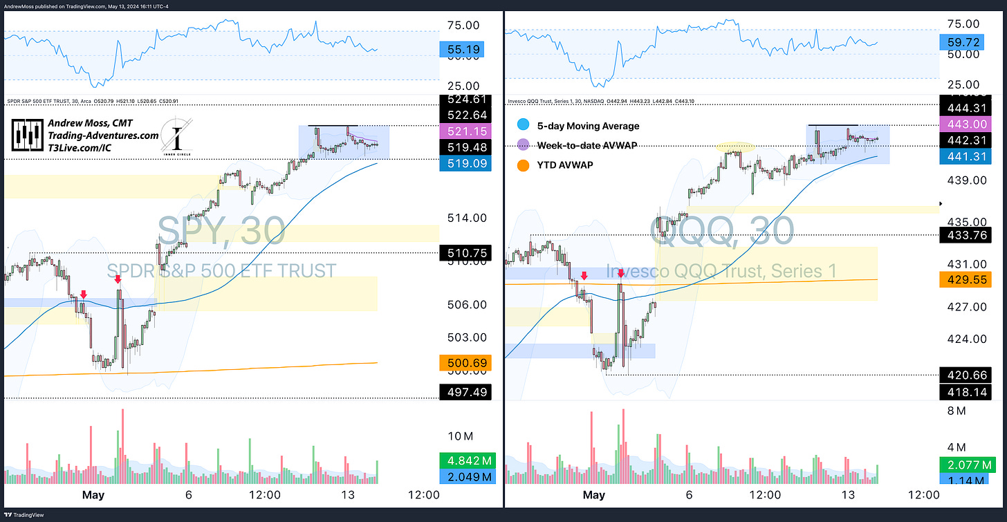 Here’s a look at the 30-minute chart of SPY and QQQ side by side —🗺️ The Roadmap.