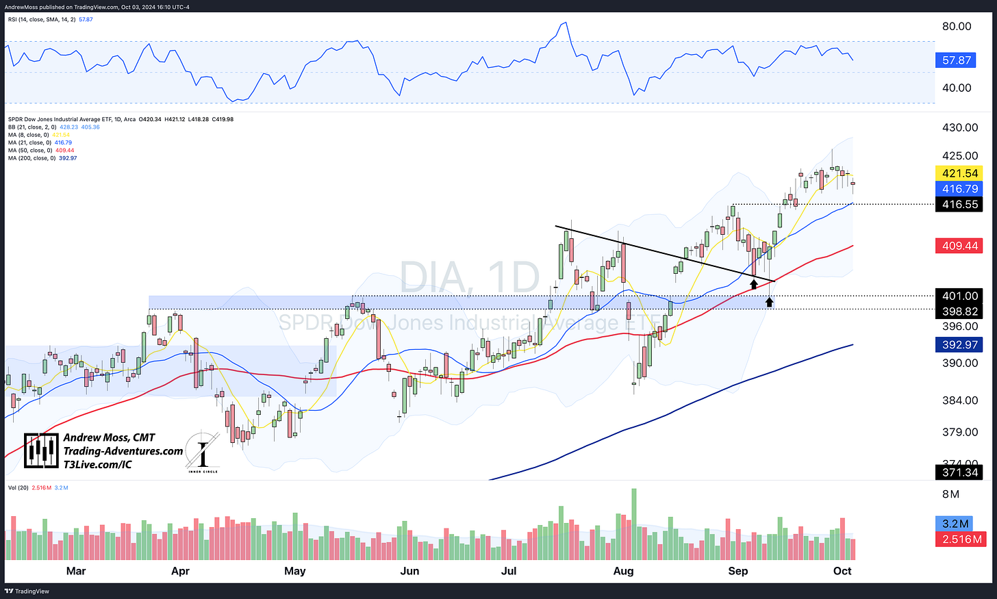 DIA continues to be a leader and must remain above $416-$417 to maintain its momentum.