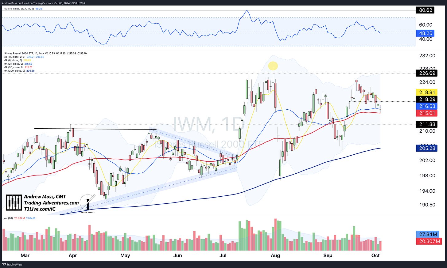 IWM is below the 8 and 21-day MAs and is trying desperately to hold the 50-day MA. It still can’t get far away (and stay) from the $212 area.