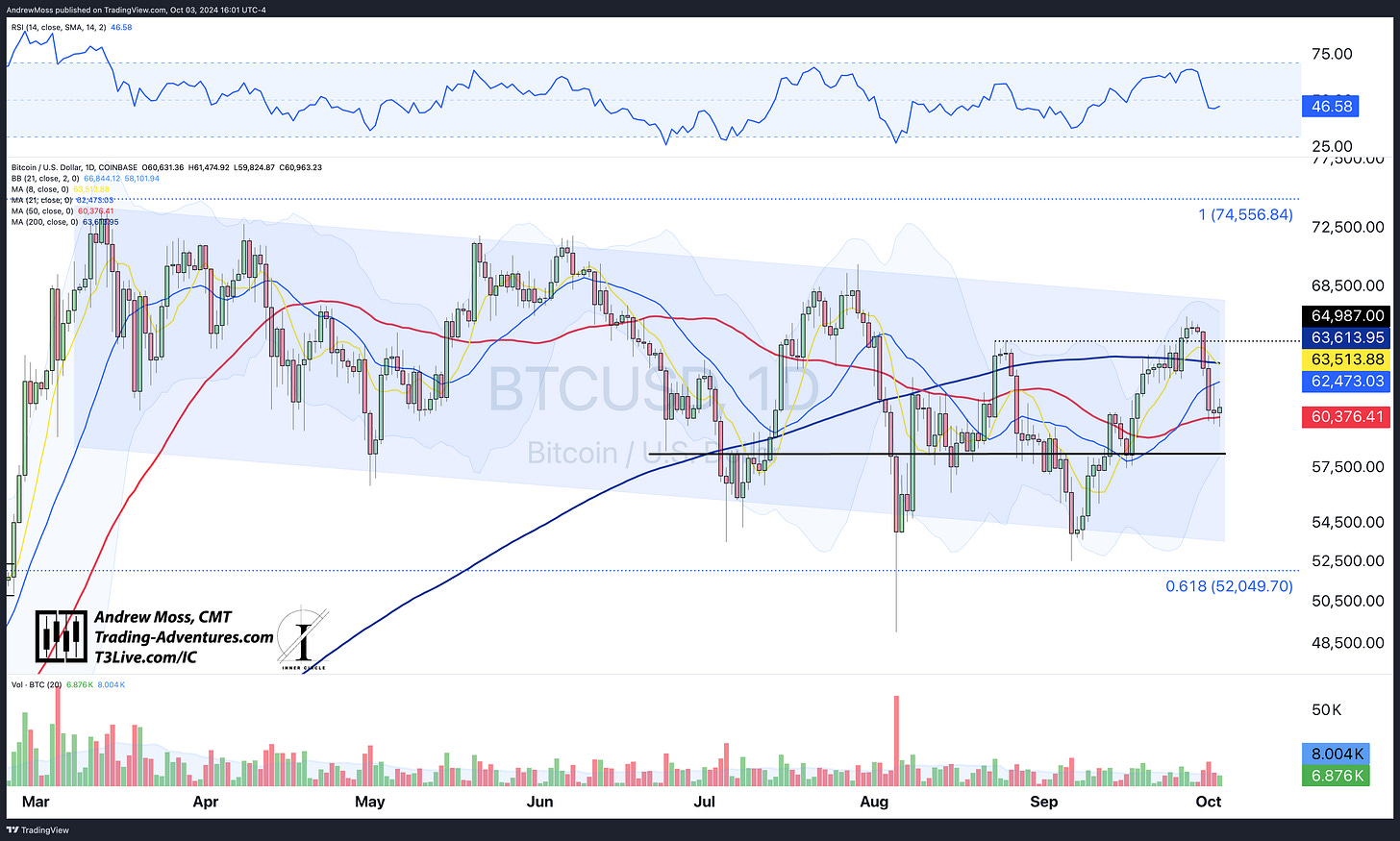 BTCUSD chop, chop continues. Nothing to see here until it breaks out of the larger, longer-term pattern. Revisit the monthly chart analysis — Near And Far — for another look.