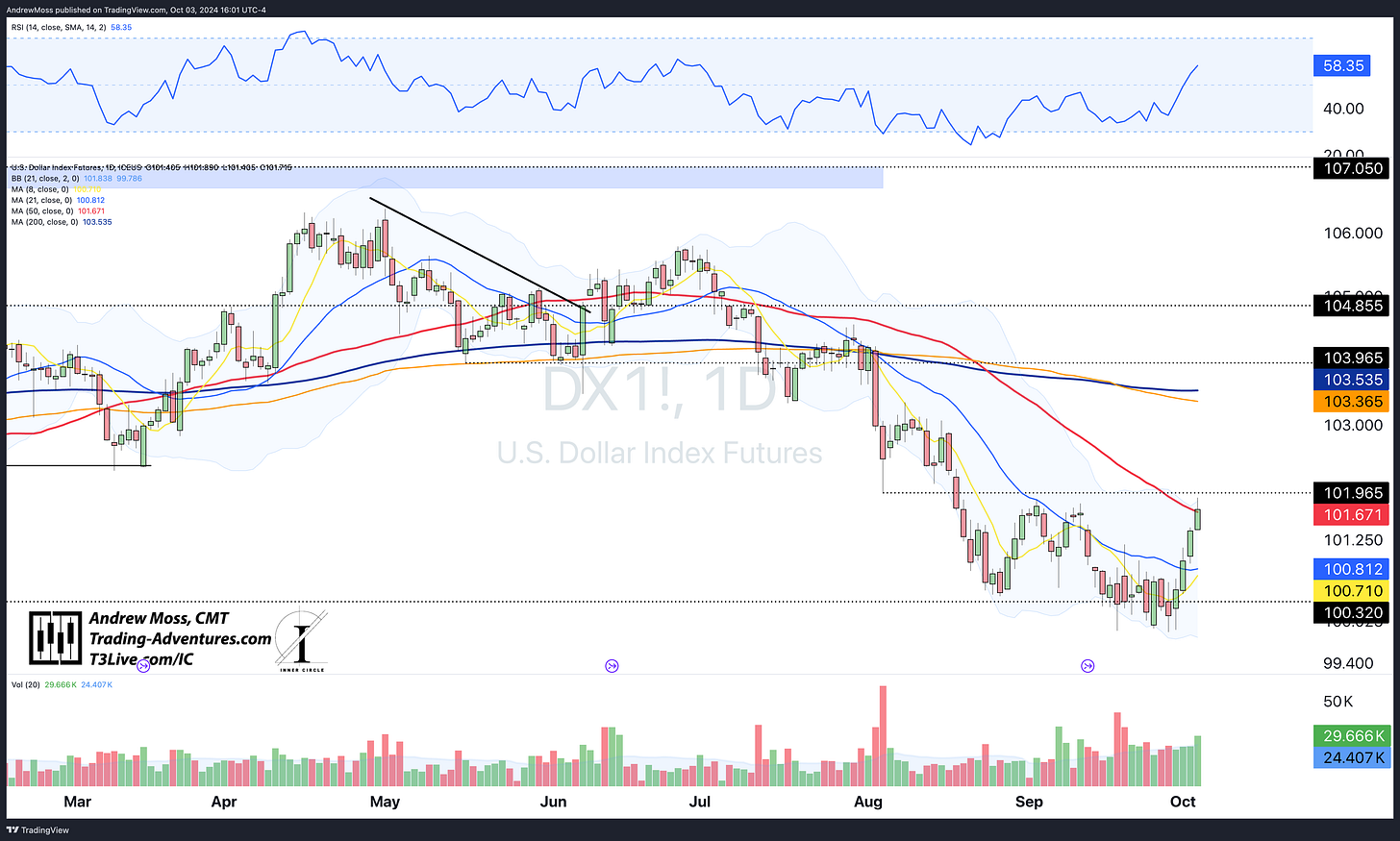 For SPY to bounce and move higher, we’ll need to see the Dollar find resistance here at the 50-day MA and pivot lows from August and begin to move lower again.