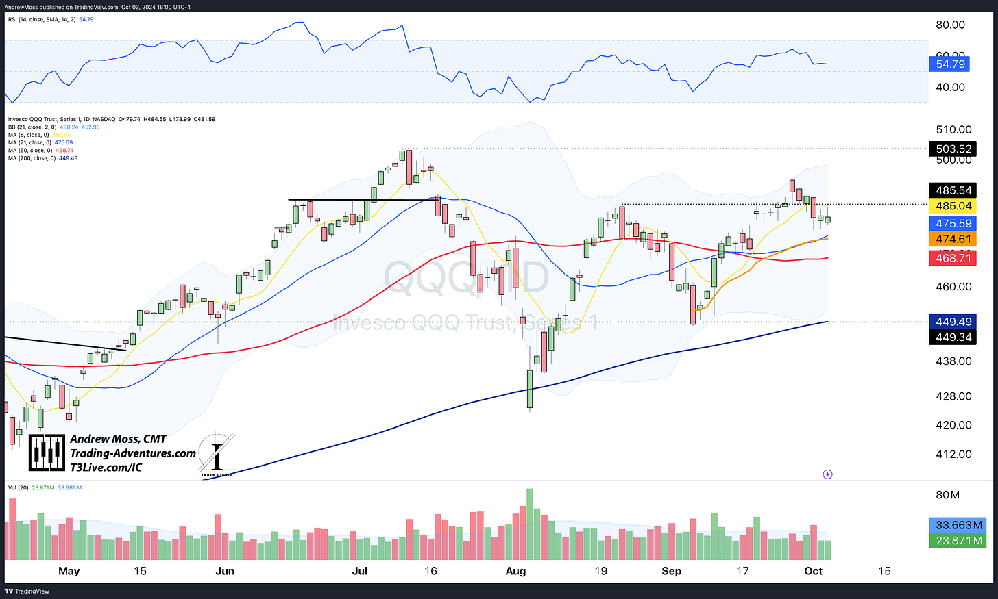QQQ has had similar consolidating action this week with the 21-day MA and pivot low AVWAP just below at $474-$475. The next support could come in at the 50-day MA, which is just barely beginning to curl upward.
